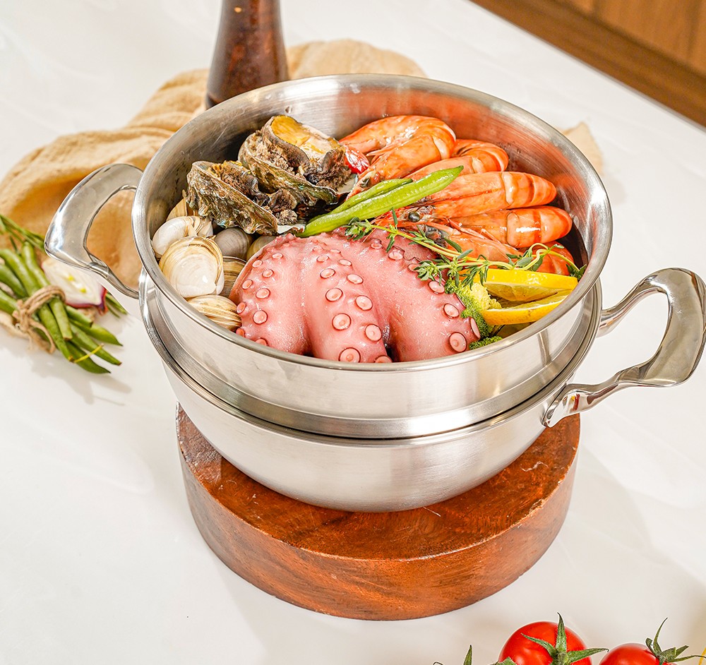 しかし、ハンイルプリマスはどんな料理を作るかによって素材の種類、厚さ、高さなどの条件をすべて熱効率に合わせて設計し、その後一枚一枚の板材を設計に合わせてクラッドして作ります。ただ他社が使う素材とは次元が違います。ハンイルプリマスの研究開発が融合されて作られた「カスタム素材」だからです!