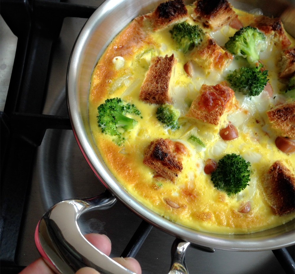 野菜が層になったこの卵料理は通常、オーブンで調理します。普通のフライパンではくっついて焦げてしまうため、うまく作れません。しかし、ルアールカッパーコアシェフパンは蓋をかぶせることで素晴らしいオーブンの役割も果たします。