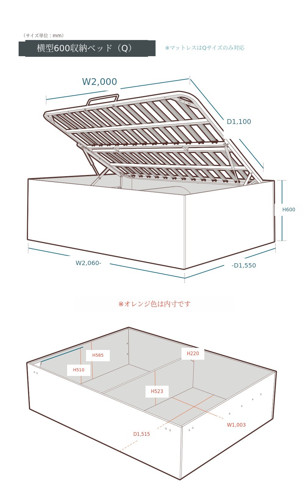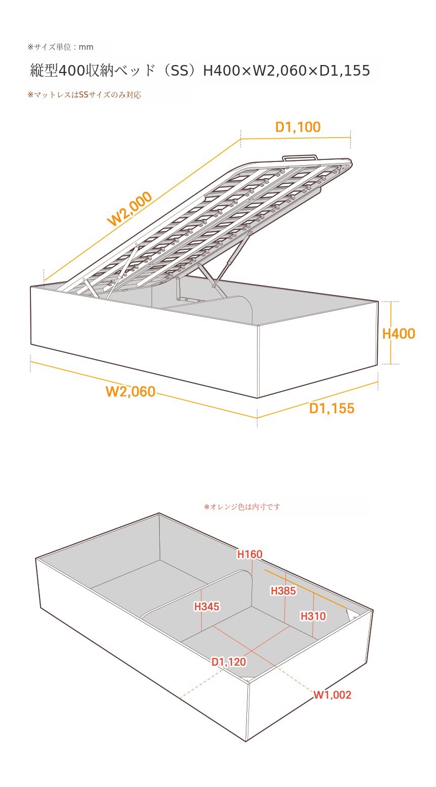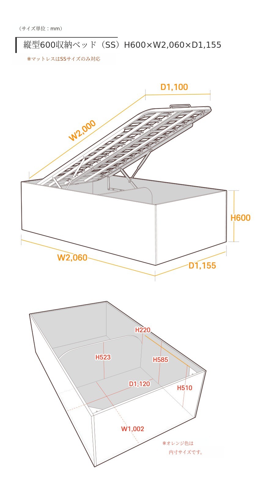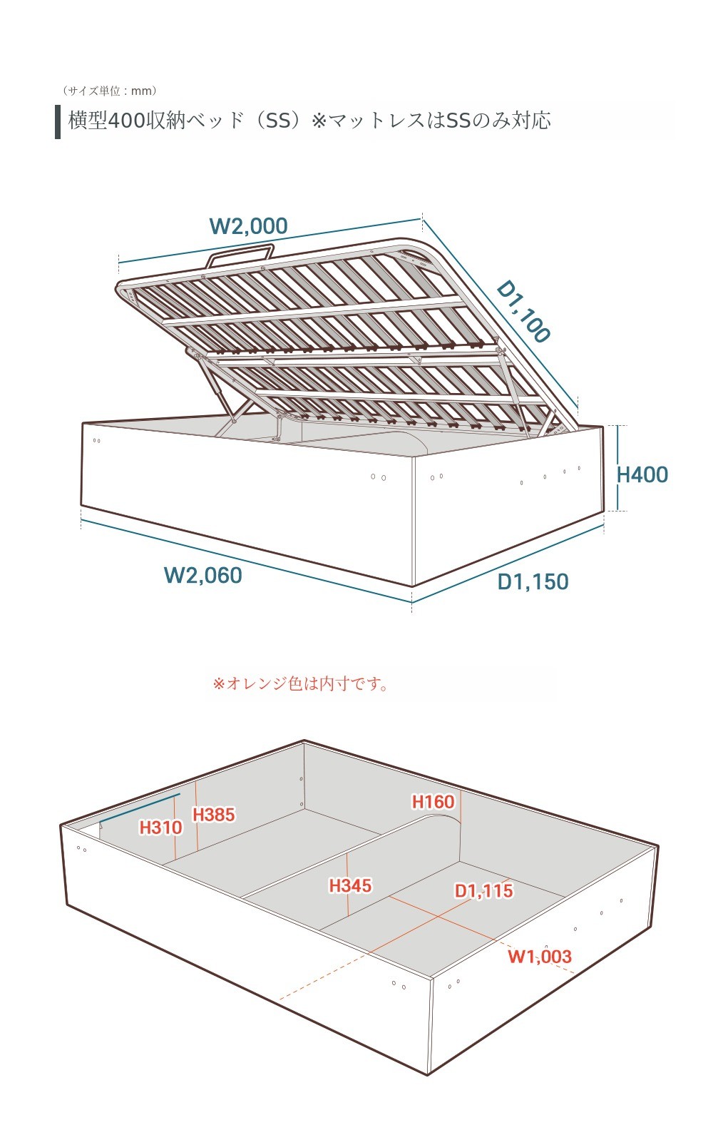 単品:リフトアップ横型400収納ベッド/リフトアップ横型600収納ベッド - 製造社および原産地:(株)ススディ、日本