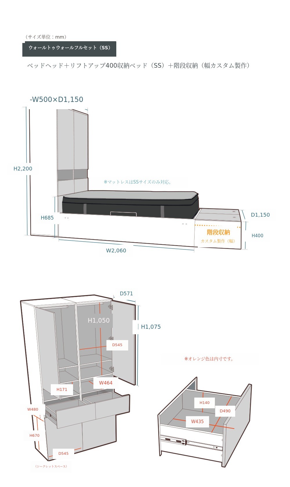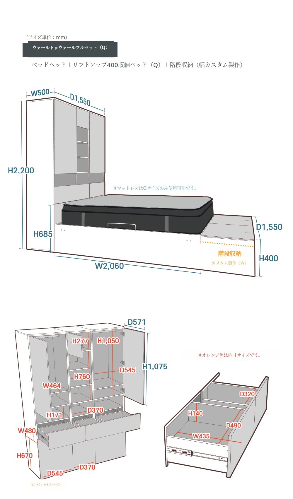- 構成:ウォールトゥウォールセット(ベッドヘッド+リフトアップ横型400収納ベッド+階段収納