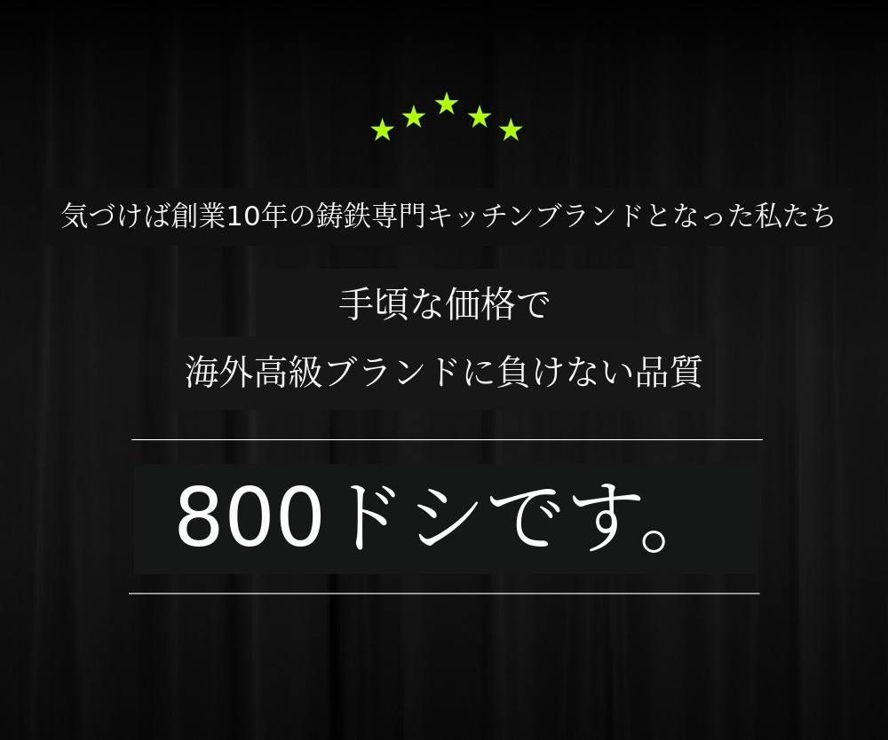 2013年の海外高級鍋復元事業を皮切りに、2022年には10年目の鋳鉄専門キッチン用品ブランドとなるまで、質の良い鋳鉄製品をお手頃な価格で提供し、有益な情報をお客様にお届けするために絶えず研究し努力しています。