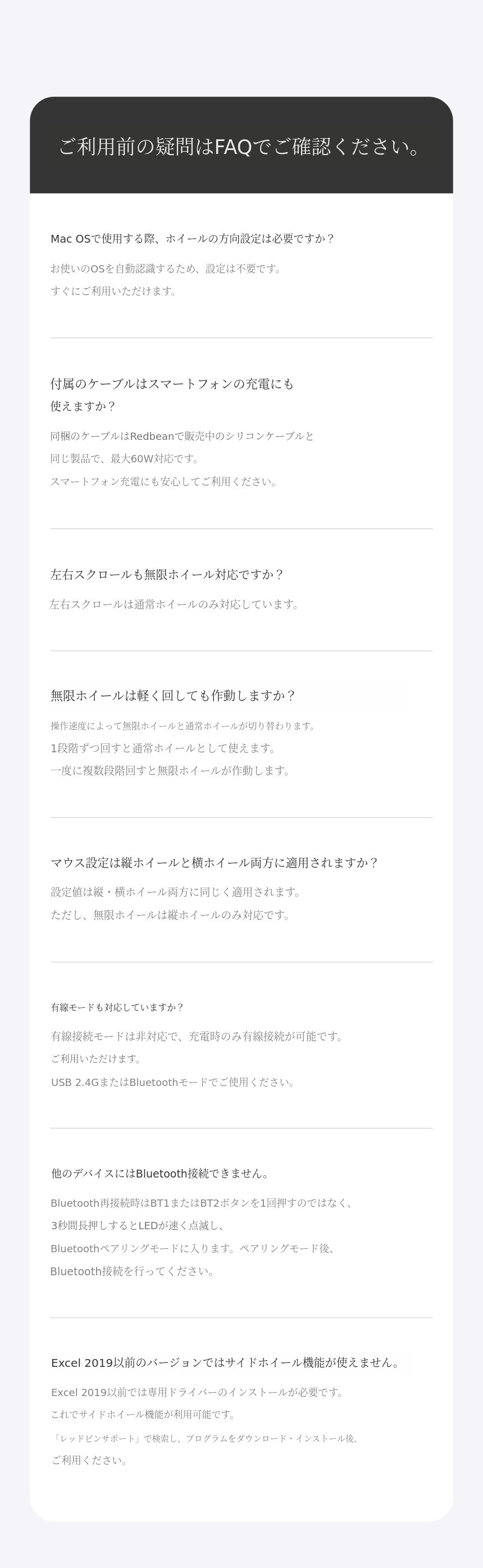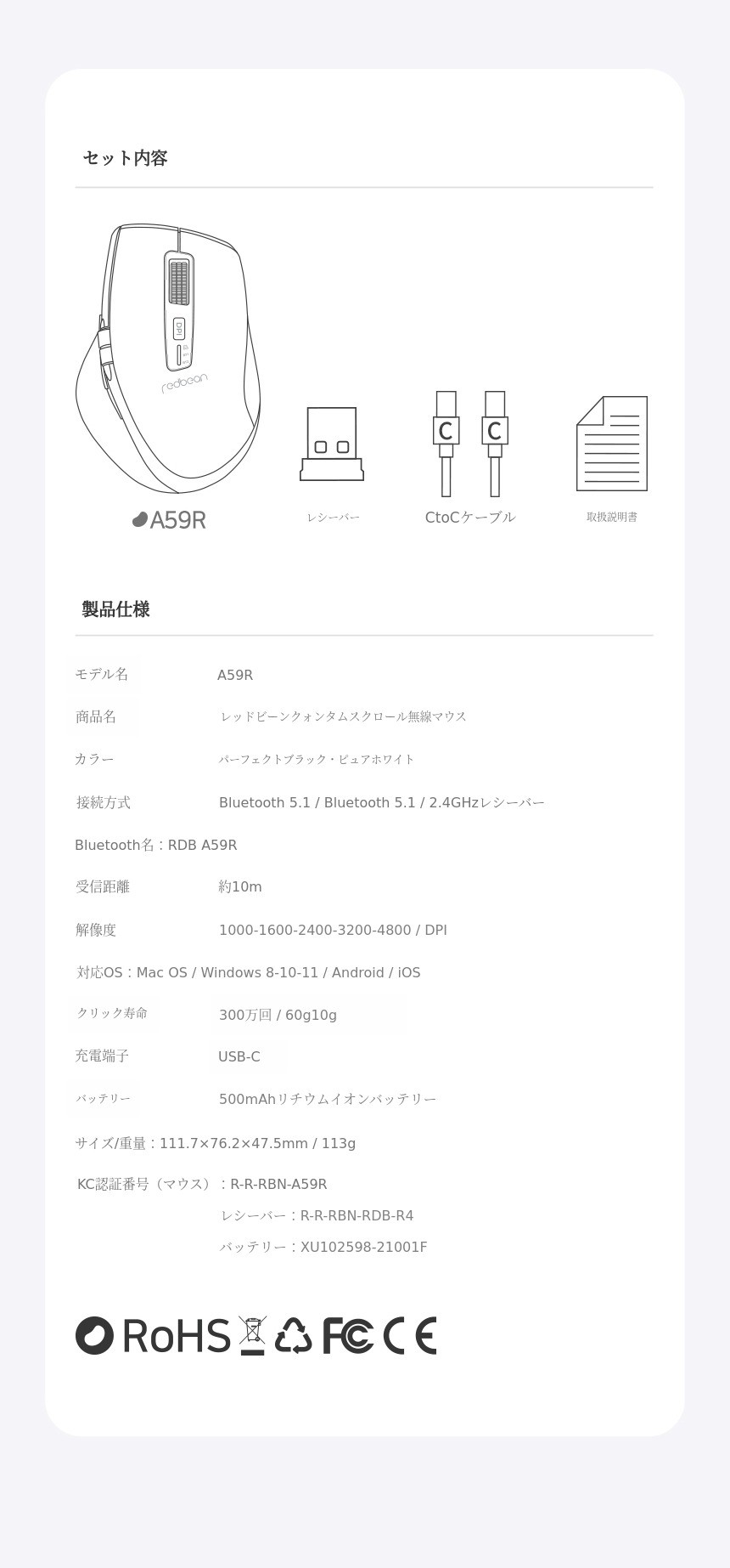 マウスの底部には、よく失くすレシーバーを保管できるよう設計し、Cタイプ充電ケーブルは高級シリコン素材とレッドビーンのロゴを刻印して、故障を減らし、使いやすく高級感のあるデザインにしました。