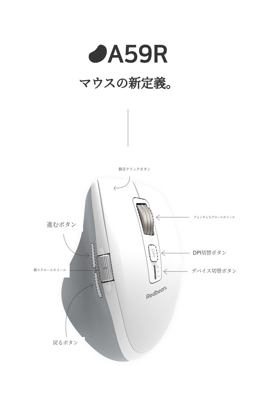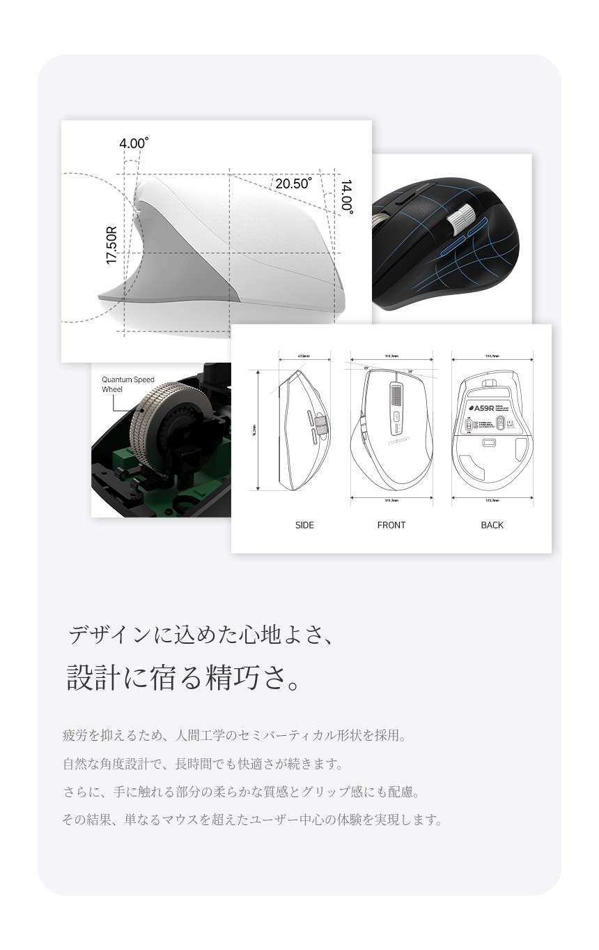 バーティカルマウスは使いにくく、一般的なマウスは手首が痛かった方へ。今回の無限スクロールマウスは「セミバーティカルデザイン」です。長時間使用しても手首への負担が少なく、手にしっかりフィットする心地よいグリップ感を体験できます。