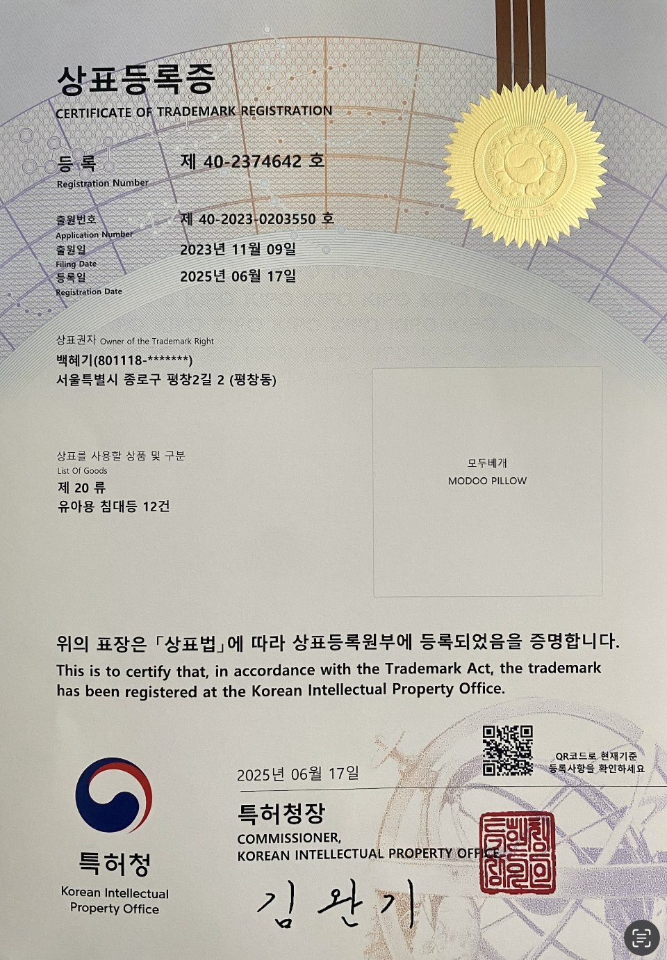 + モドゥピロー/Modoo Pillow 商標が2025年6月に登録されました。