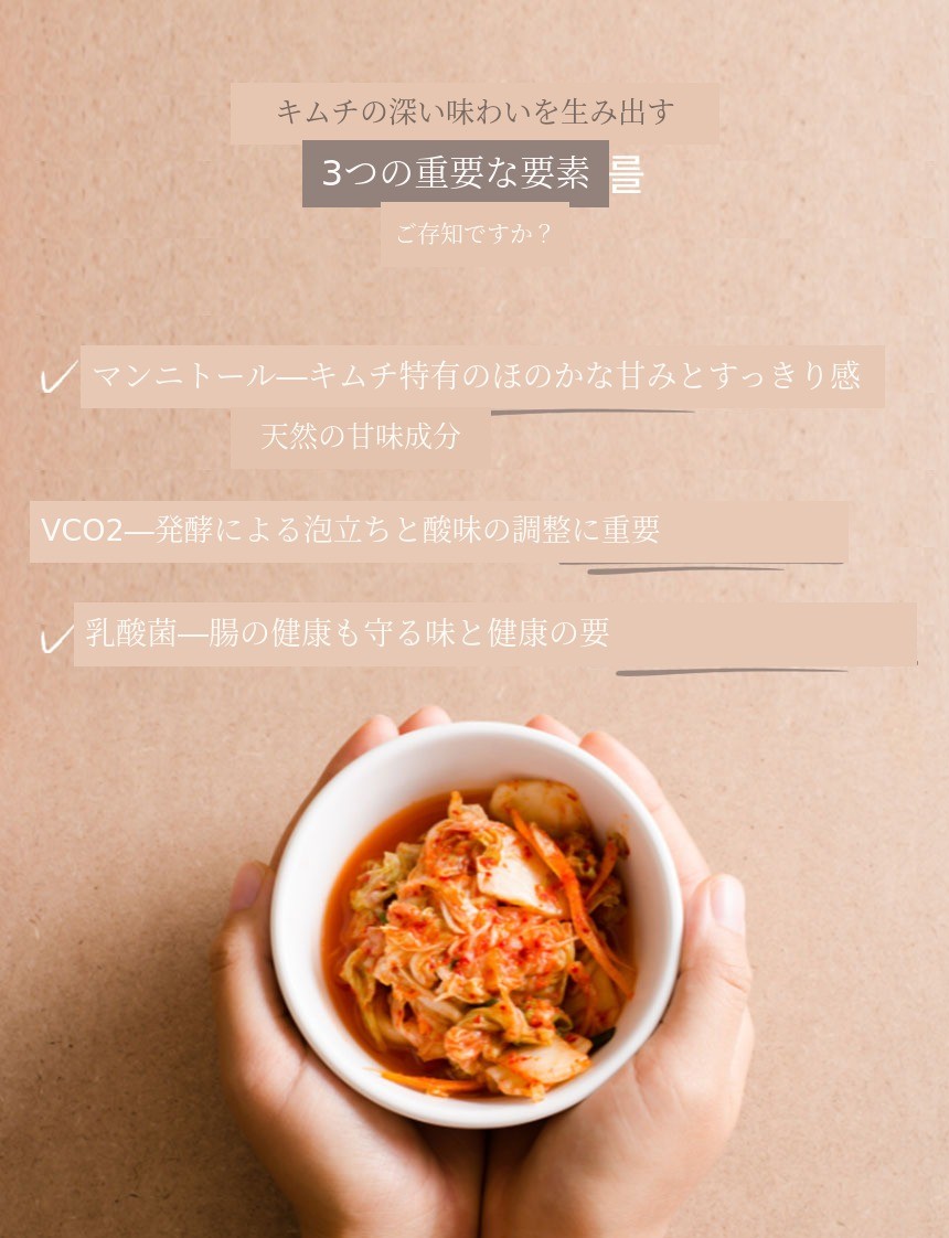 腸の健康を助け、食物繊維を分解する有機酸の生成など、キムチ乳酸菌の核心であり、適切な温度・時間・湿度条件が揃ってこそ活性化されます。