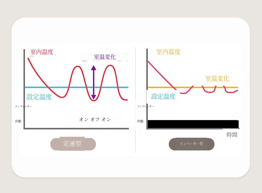 従来の「定速型」コンプレッサーはオン・オフを繰り返しながら騒音とエネルギー損失を引き起こします。これは温度変動が大きく、消費電力も高いためキムチの熟成に不利です。一方、インバーター型コンプレッサーは作動後に微細に速度を調整しながら連続運転します。騒音なく一定温度を維持し、必要な分だけ電力が消費されます。