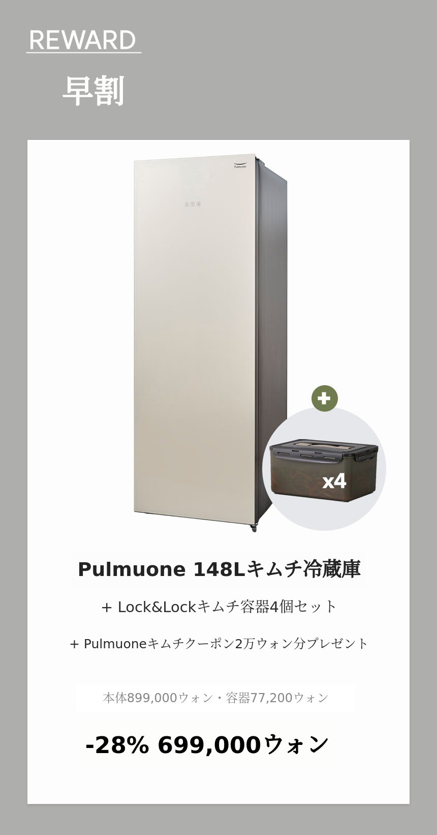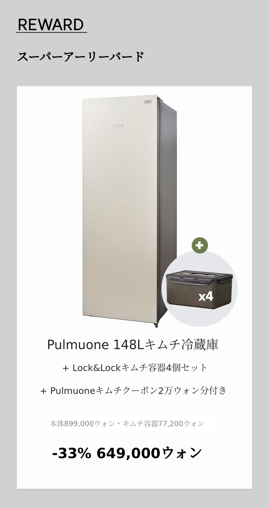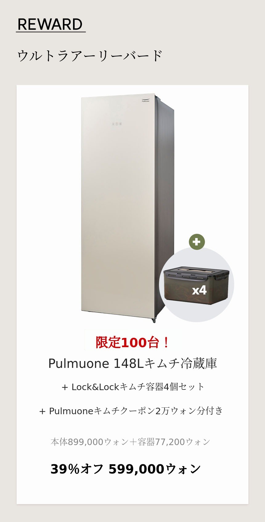 今回の製品は「199L以下のキムチ冷蔵庫」の中で最も高いエネルギー消費効率等級(2等級)を取得し、消費者の皆様により効率的な製品をご紹介できるようになりました。これを記念し、プルムウォンの哲学と技術が詰まったキムチ冷蔵庫をより多くの方にご紹介したく、Wadizファンディングを行うことになりました。Wadizでしか手に入らない限定特典もご用意しておりますので、この機会をお見逃しなく!