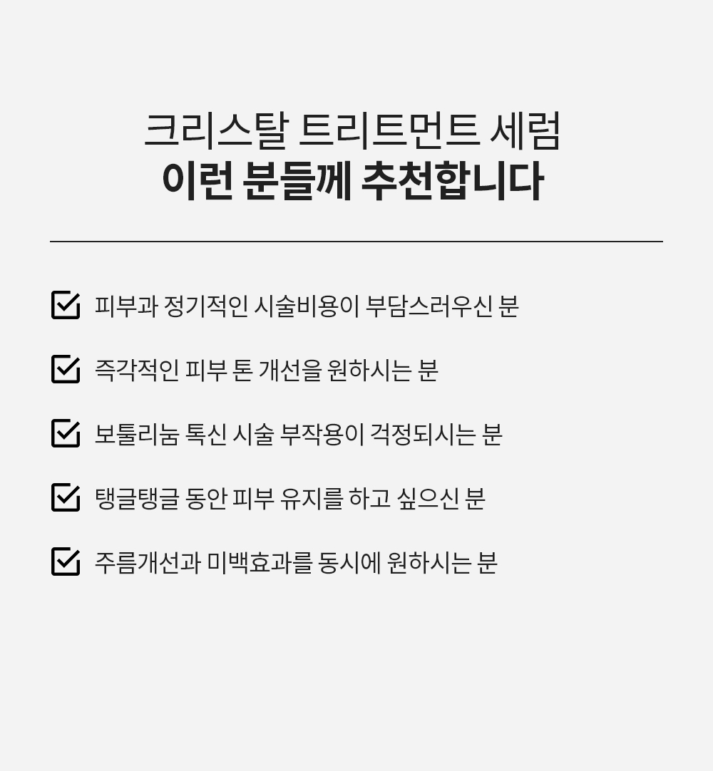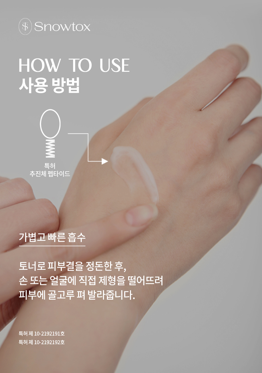 주사 등 전문 시술로만 가능하였던 톡스를 온전히 화장품으로 바를 수 있도록 개발하였습니다.
