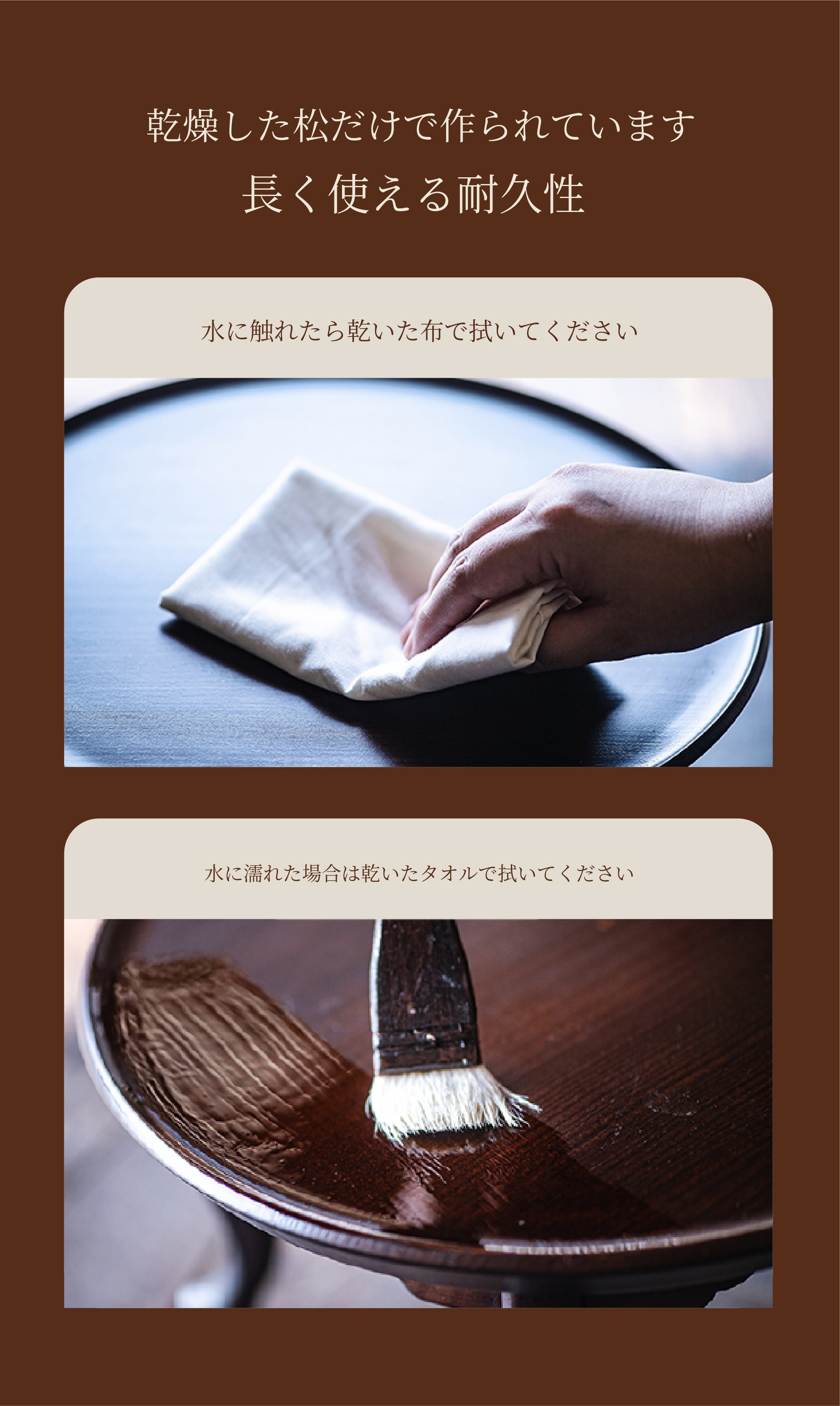 無垢材製品は使用中、季節や気候の変化によって膨張と収縮を繰り返し、跡や模様が自然に生じる特性があります。