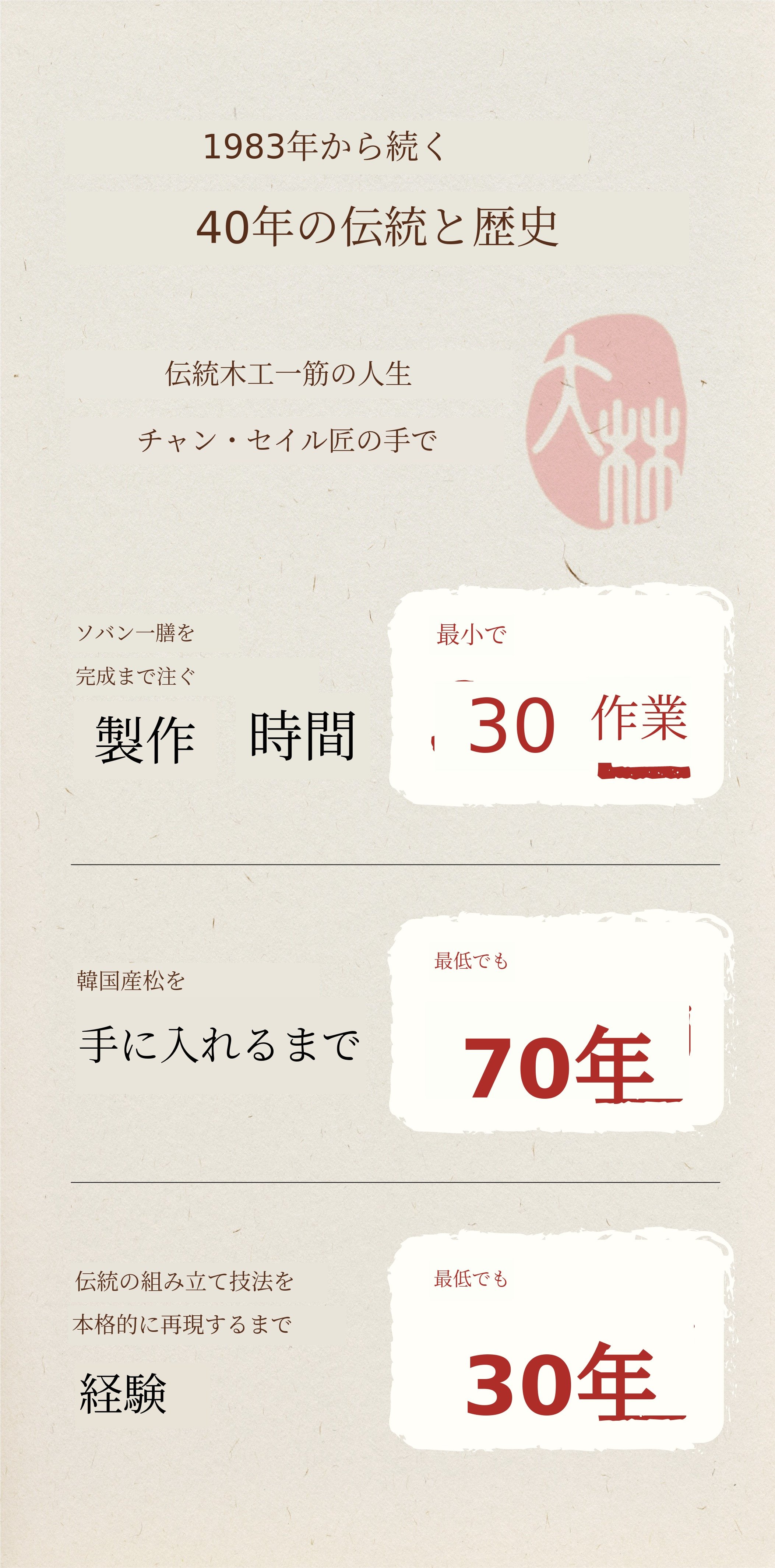 私たちの伝統遺産を大切に守るため、国産松および組み合わせ技法を堅持し、伝統と現代的な感覚が調和するデザインを絶えず研究し、発展させるよう努めています。