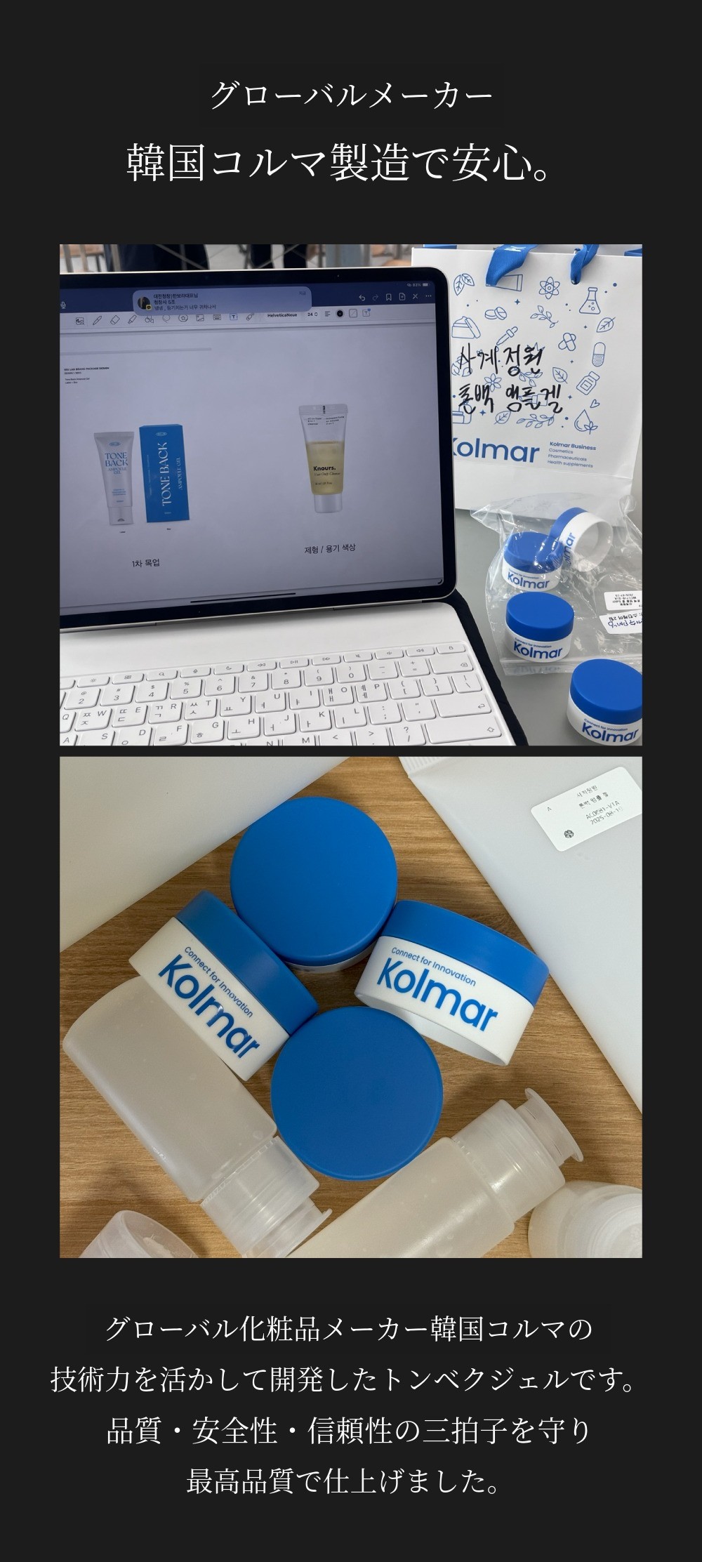 今回ご紹介する「トーンバックアンプルジェル」は、中小ベンチャー企業部主催の支援事業に選定され、KAIST化学科出身の化粧品学科教授と共に特許成分を開発して作った初めての製品です。