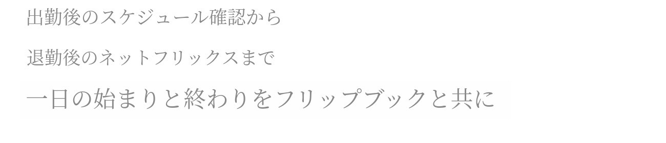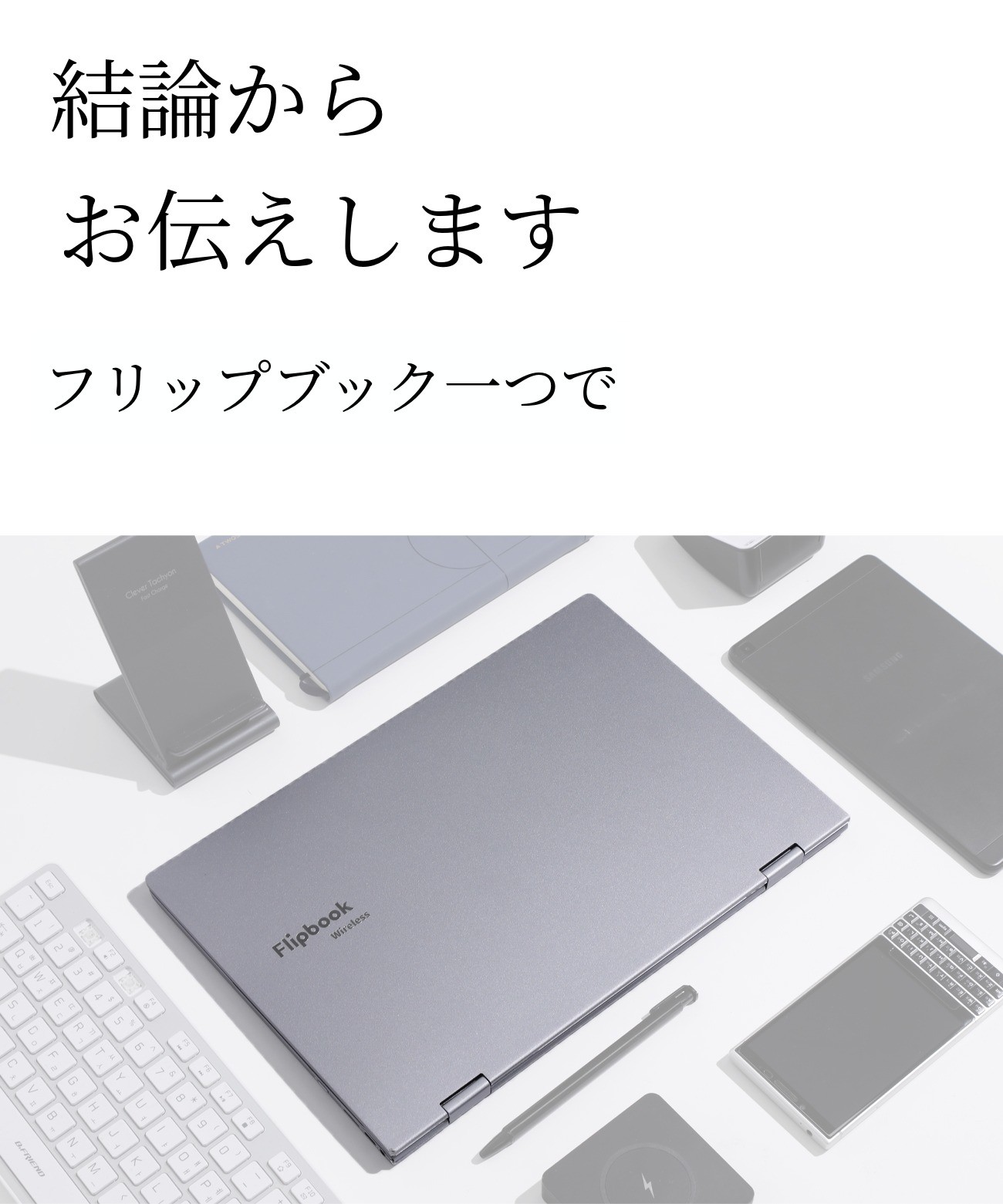 個人差はもちろんありますが、軽いドキュメント作業をされる方であれば、フリップブックver.1は5時間以上使用された方もいらっしゃいました。作業環境や充電器の状態によって異なる場合があることをあらかじめお知らせします。