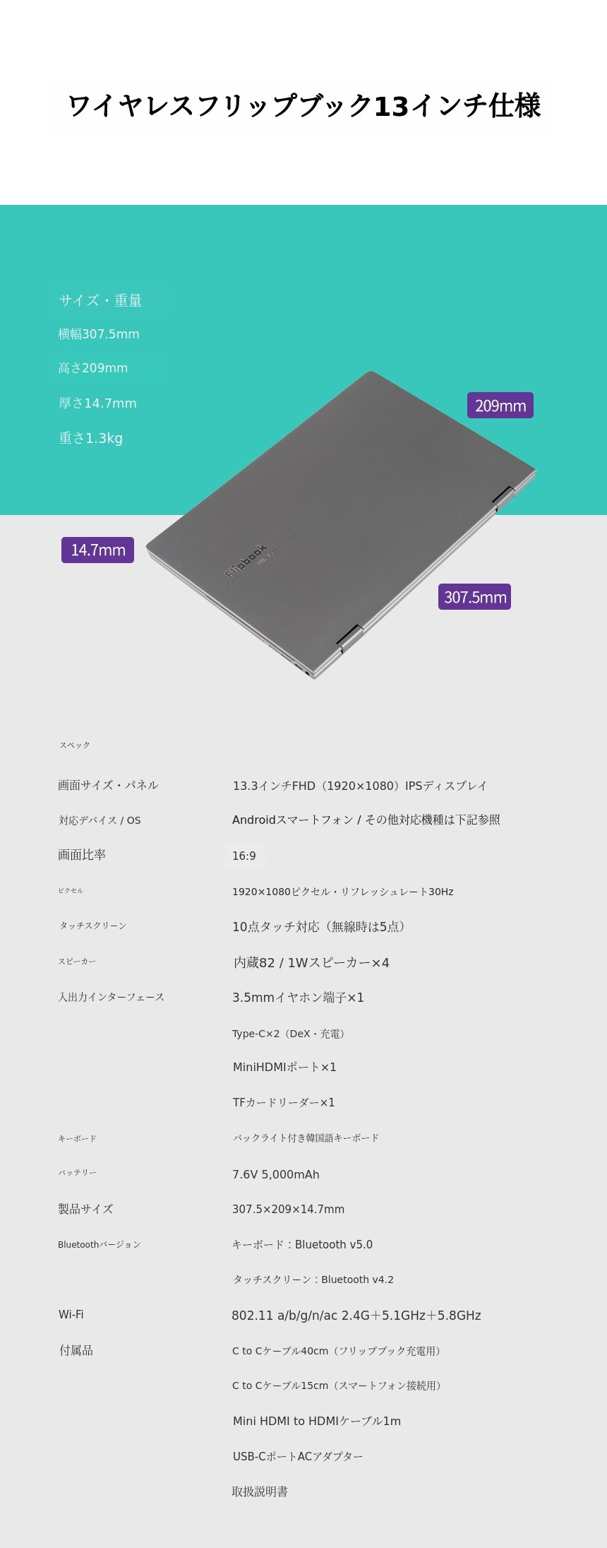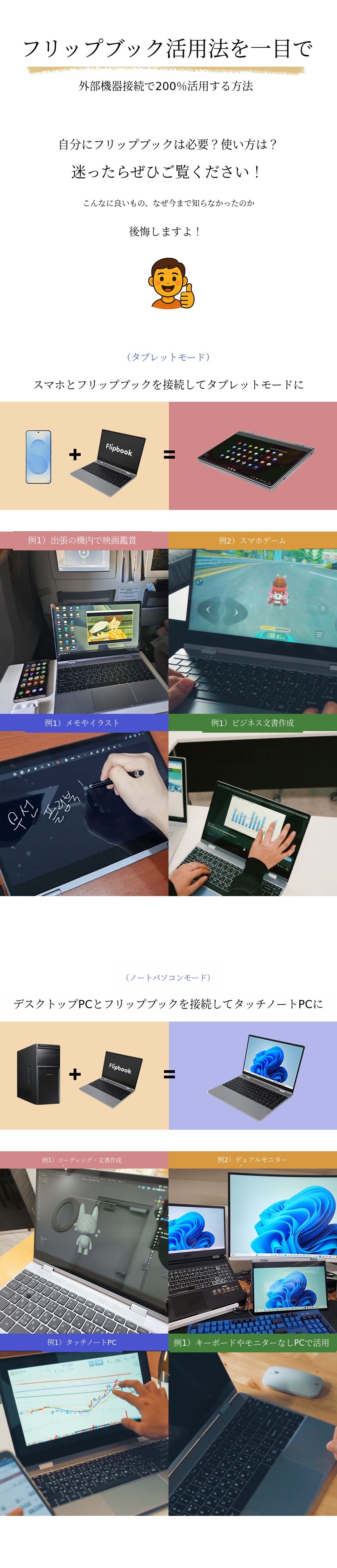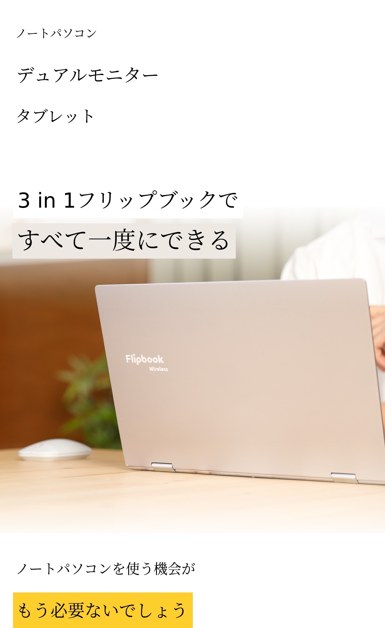 スマートブックも同じです。ワイヤレスフリップブックはノートパソコンやスマートフォンとの無線接続をサポートし、時にはデュアルモニターのように、時にはノートパソコンのように、時にはタブレットのように、ユーザーの目的に合わせて自由に変わります。