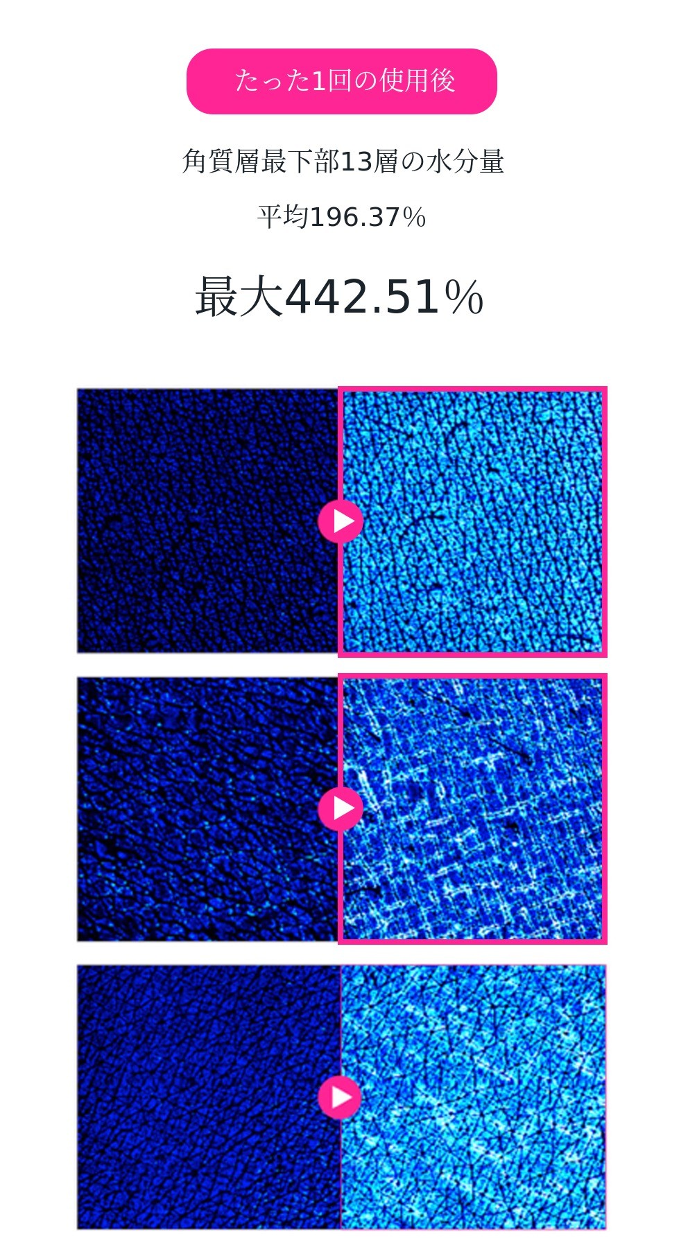肌の奥深くまで最大1,000倍の水分をより多く、より長く満たします。純度100%低分子だけで体験できる目に見える変化。