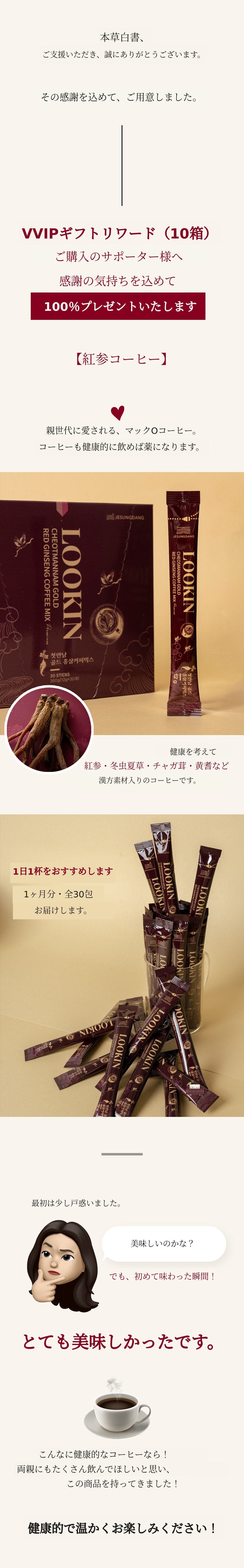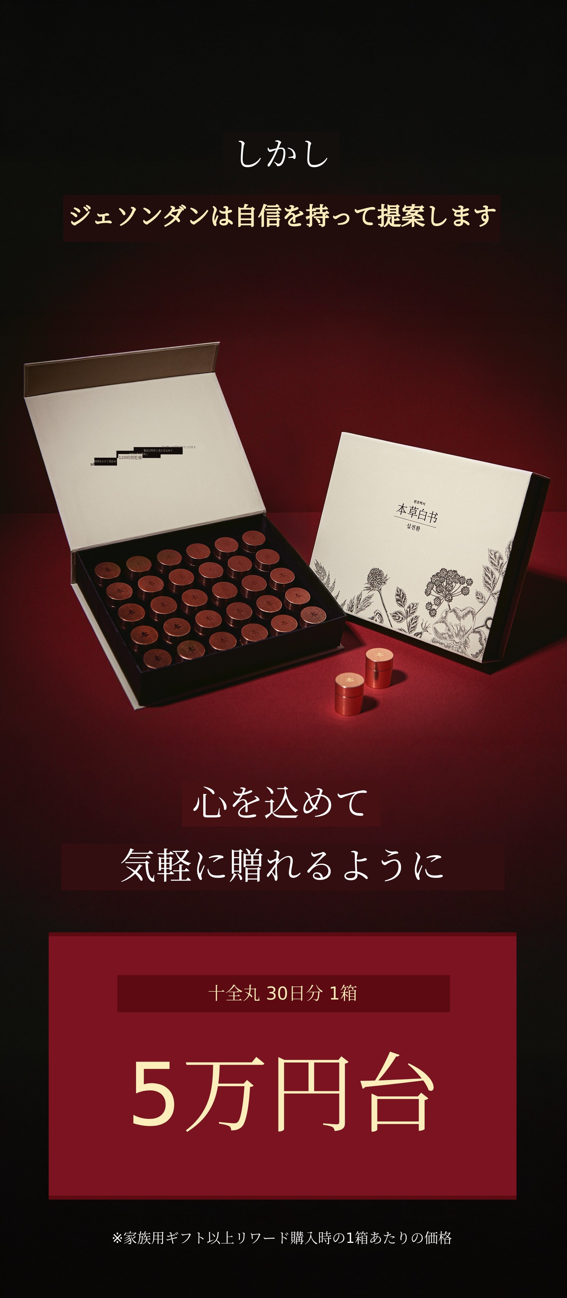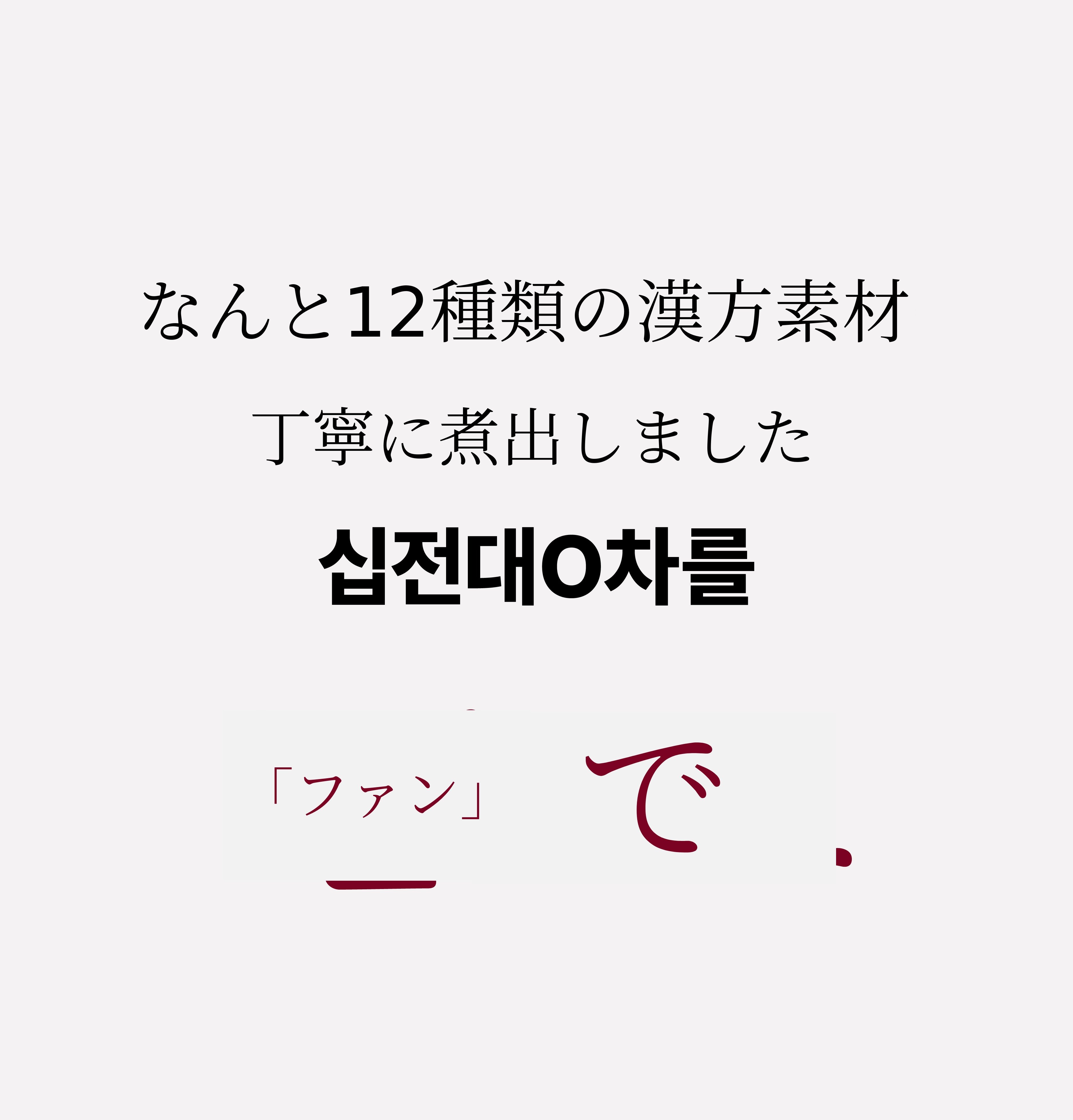 そこで今回は、十全丸という特許技術で認められた製品を、もう一度サポーターの皆様にお見せしたいと思いました。そして漢方医院に行かないと食べられないこの製品を、合理的な価格で多くの方にぜひ召し上がっていただき、皆様が健康であってほしいという思いで自信を持って作りました。自分自身はもちろん、周りの大切な方々への貴重な贈り物になれば幸いです。
