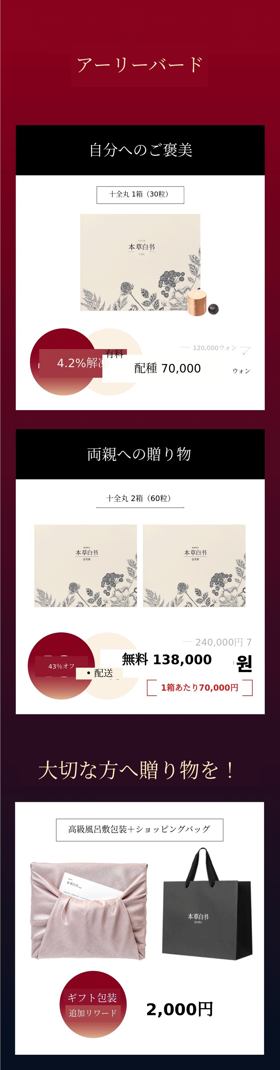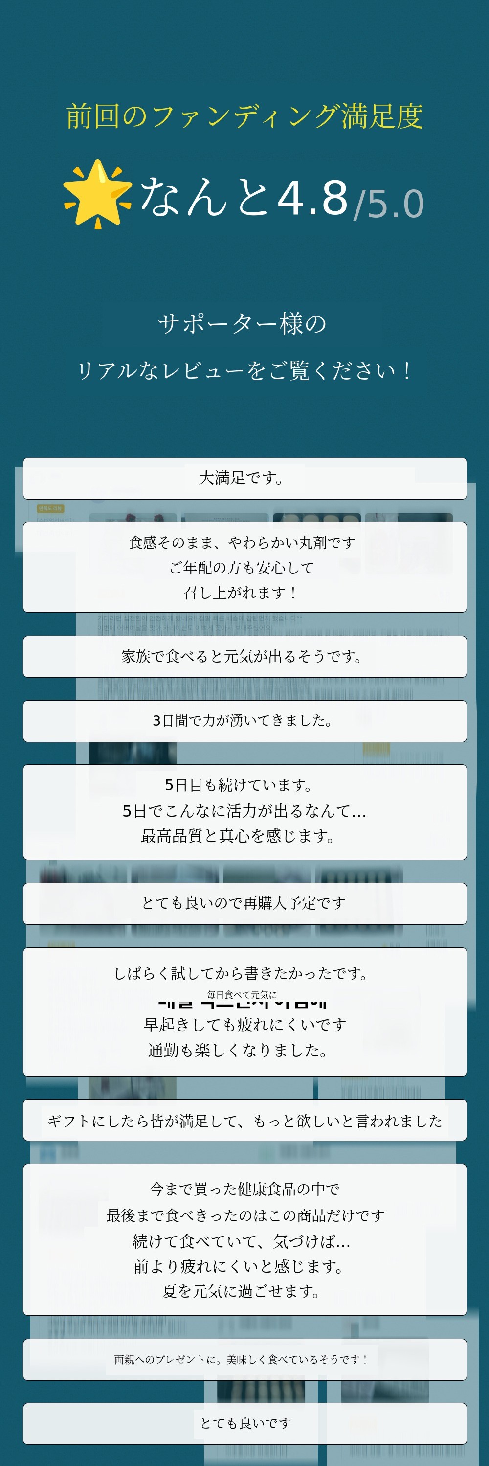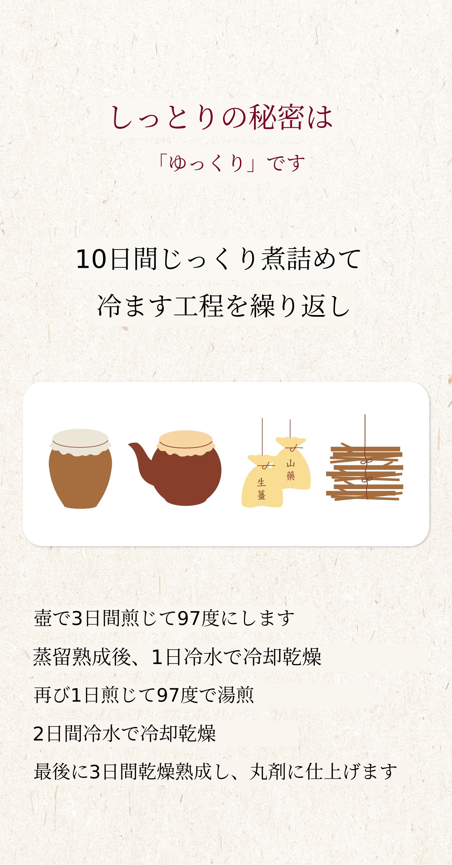 そこで今回は、十全丸という特許技術で認められた製品を、もう一度サポーターの皆様にお見せしたいと思いました。そして漢方医院に行かないと食べられないこの製品を、合理的な価格で多くの方にぜひ召し上がっていただき、皆様が健康であってほしいという思いで自信を持って作りました。自分自身はもちろん、周りの大切な方々への貴重な贈り物になれば幸いです。