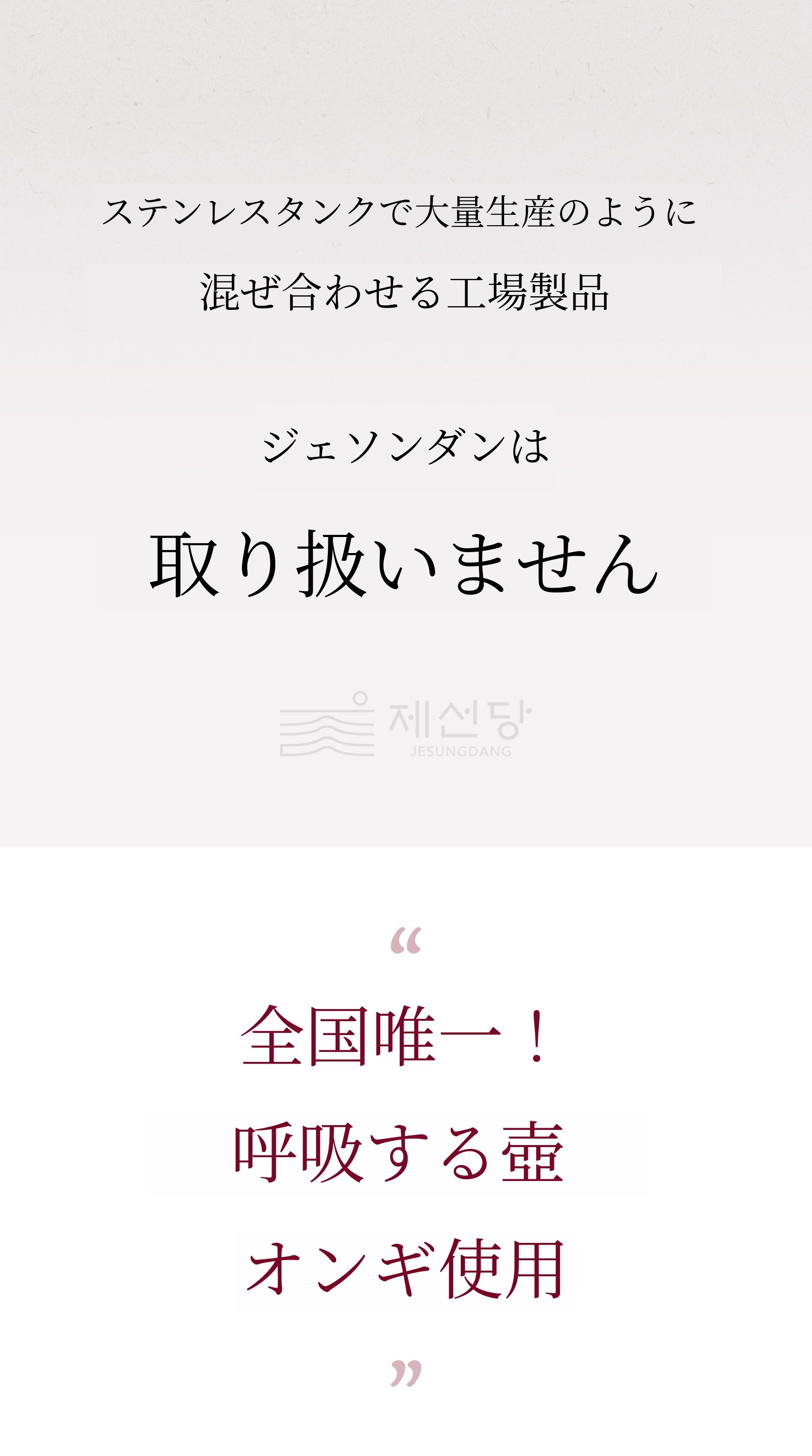 良いものを作る家で皆様の健康を考えながら過ごして10年という月日が経ちました。私は初心を忘れず、真心を込めて家族と一緒に食べられる製品を作っています。天然素材をそのまま挽き、甕で熟成させる伝統的な方法で製造しているため、機械で作られる健康食品とは異なる手間がかかっています。手間を惜しまない分、より良い健康食品になると信じ、今後も最高の真心を尽くすことを皆様にお約束いたします。ここは新羅千年の古都、慶州です。千年続く祖先の知恵を学び、受け継ぐ私の心は常に皆様のための心です。一つ一つの原料に真心を込め、最高の原料を探し、最適な条件を整え、愛する家族(皆様)の健康を考えながら長い熟成の時間をかけます。熟成の時間を経て作られた私たちの製品に、私たちのこの思いも込めて皆様にお届けできればと思います。
