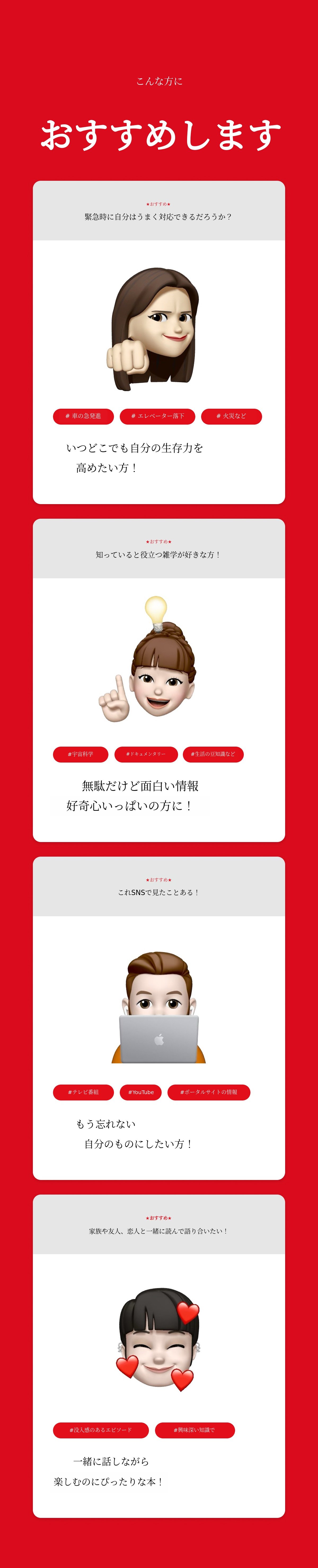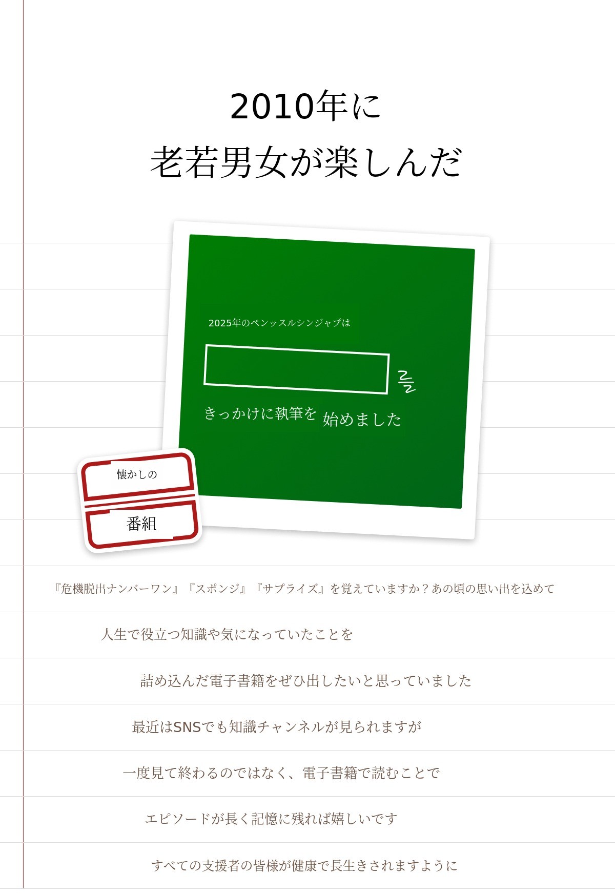 最近はSNSで知識伝達コンテンツを多く目にしますが、エピソードを一つ一つ集めて電子書籍として企画し、豊富な資料集をお届けしたいと思い、サポーターの皆様にご紹介したかったです。スポンジや危機脱出ナンバーワンのような知識伝達コンテンツに興味のあるすべての方にとって、良い資料集になることを期待しています。