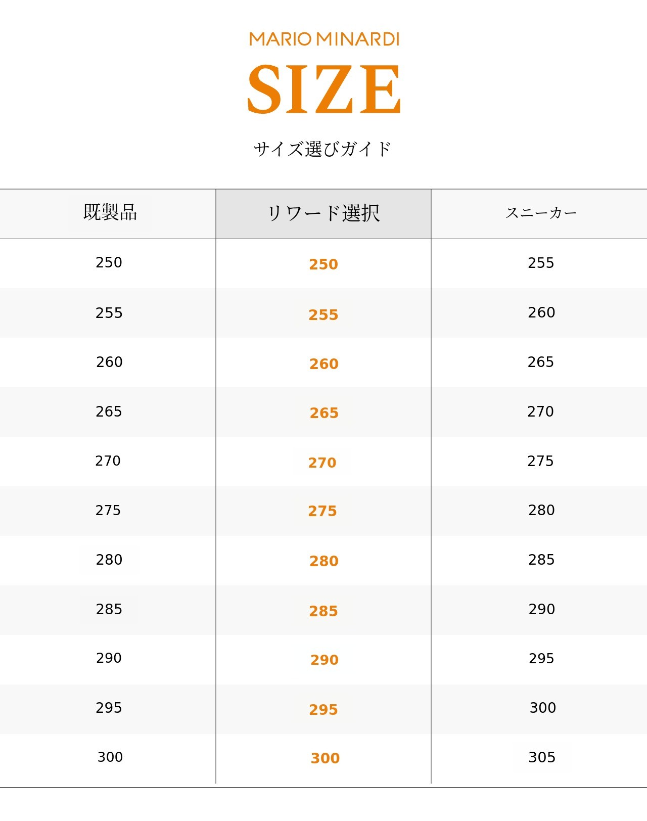 285~300サイズは別途リクエストにより対応できるリワードです。 285~300リワードを製作依頼される場合、単純な心変わりによるキャンセルはできません ます。正確なサイズが分からない場合 メーカーにお問い合わせまたは カカオトークチャンネル(クリック)でリクエストいただくと、サイズ確認が可能なフィッティングサンプルを無料でお送りします。 マリオミナルディリワードの予約購入が初めてでサイズ確認が必要な場合、マリオミナルディサイズ確認が可能なフィッティングサンプルを無料でお送りしています。お気軽に カカオトークチャンネル マリオミナルディでご連絡ください。マリオミナルディに合うサイズを確認いたします(海外サポーターの場合、フィッティングサンプルの無料宅配サービスはご利用いただけません)