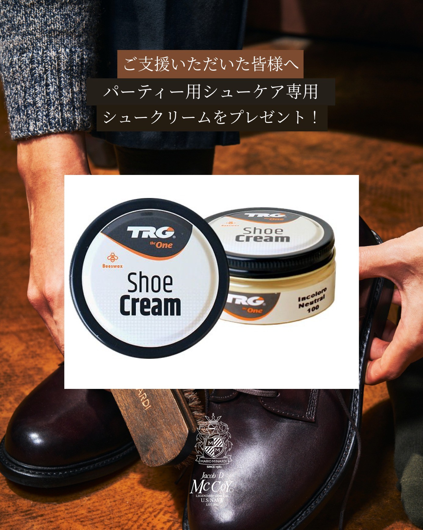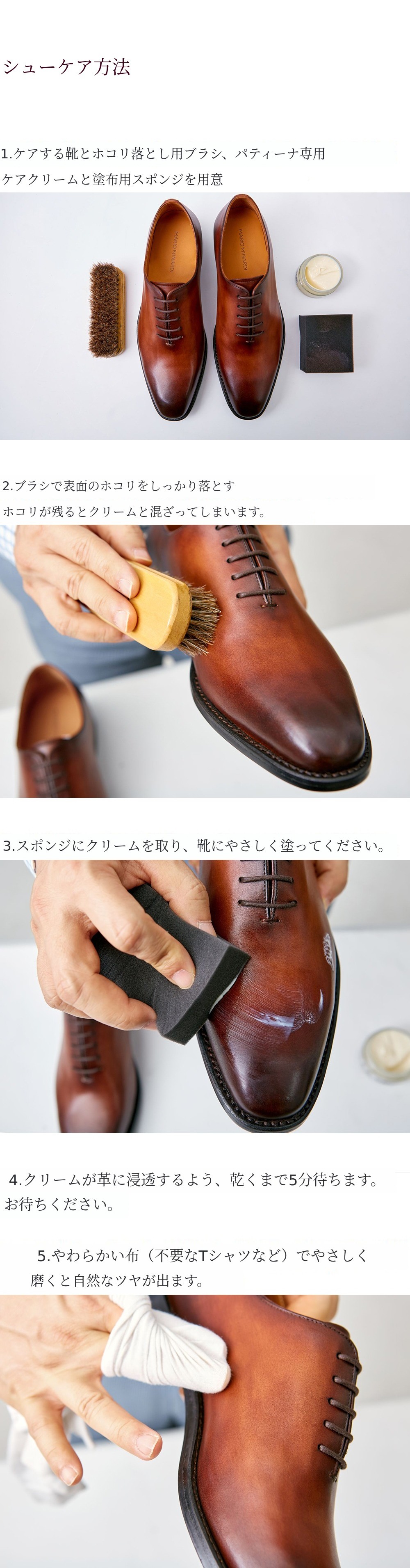 パティーナの色味は高級感がありますが、その美しいカラーを長く楽しむためには、時々シュークリームでケアすることをおすすめします。水光や火光は絶対に禁止です. 軍隊の戦闘靴のように 革の表面状態が良くなく、全体を削り取って強くコーティングした低価格の革の場合のみ水光や火光が合います ます。 パティーナシューズは無色のシュークリームで軽く拭くことをおすすめ します