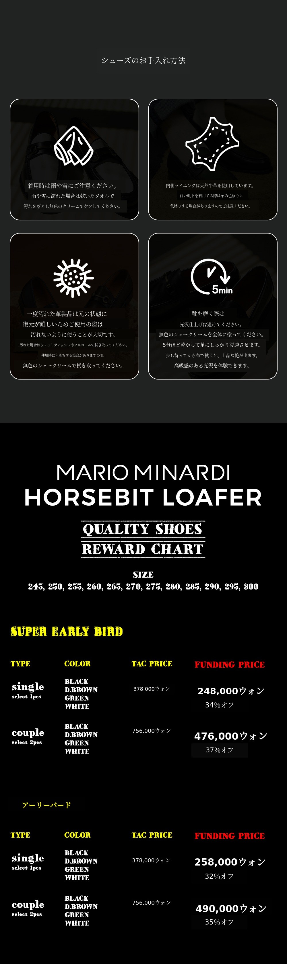 Wadizを通じてマリオ・ミナルディを広く知っていただきたいです。多くのサポーターの皆様がグッドイヤーウェルト製法を基盤として、パティーナ技法を通じて高級感のある外観を演出するMAIRO MINARDIと共に楽しい体験をしていただきたいと願っています。サポーターの皆様のレビューで証明された履き心地もおまけです。合理的な価格と感覚的なスタイル、そして履き心地まで検証されたMARIO MINARDI を履いて幸せな一日を始めていただければと思います。集まったファンディング金額はリワード製作と次のプロジェクトの新製品開発費用に使用されます。