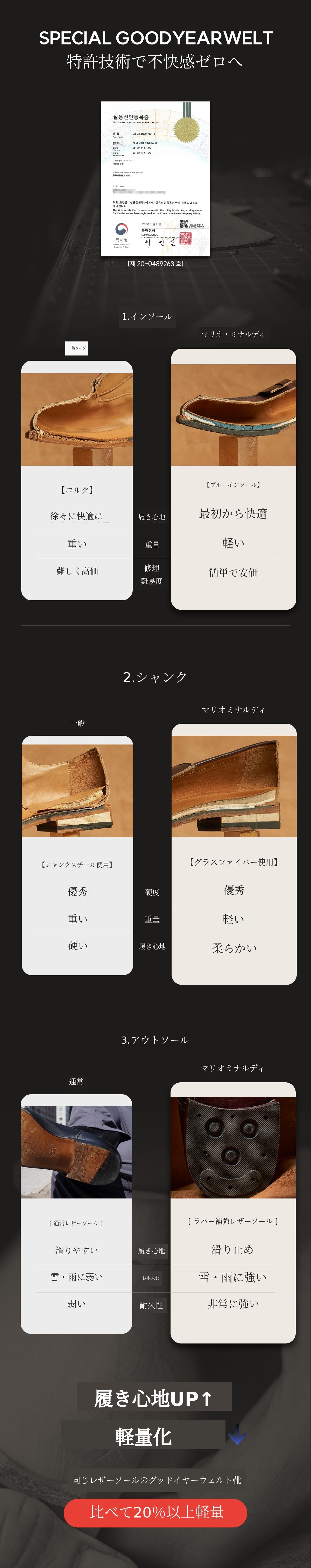 (株)シューズナインは海外で製造された商品を単に輸入して国内で流通させる流通業者ではありません。韓国人の足に合うラストを開発し、韓国市場に合うデザインにグッドイヤーウェルト製法とパティーナ技法を適用し、履き心地を改善するために絶えず努力した結果、機能性ミッドソールを開発し実用新案登録も完了しました。これらすべての成果物を組み合わせ、韓国男性に最も適した製品を最もよく作れる製造工場に依頼してOEM製作するメーカーです。インドネシア工場はグッドイヤーウェルト製法とパティーナ染色に特化したハンドメイドシューズ工場です。