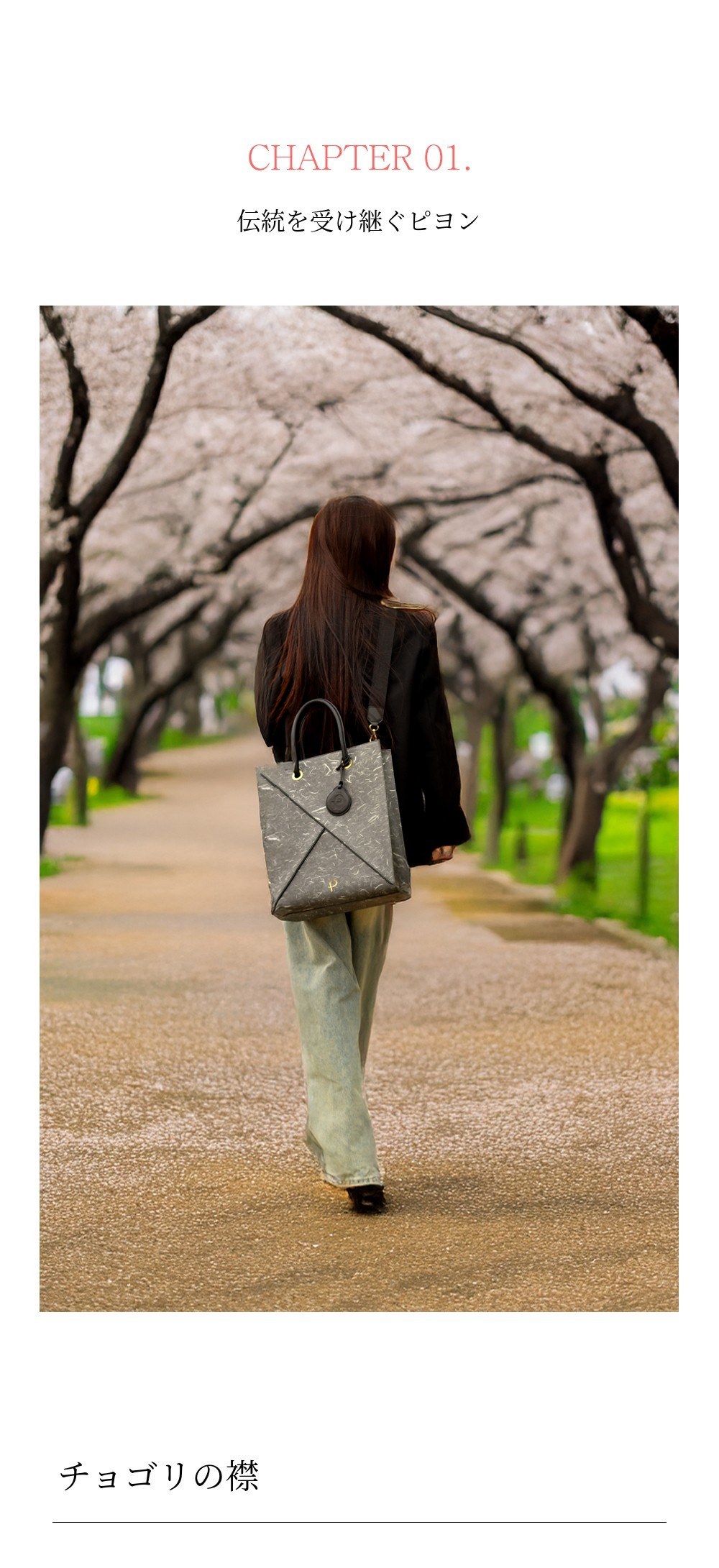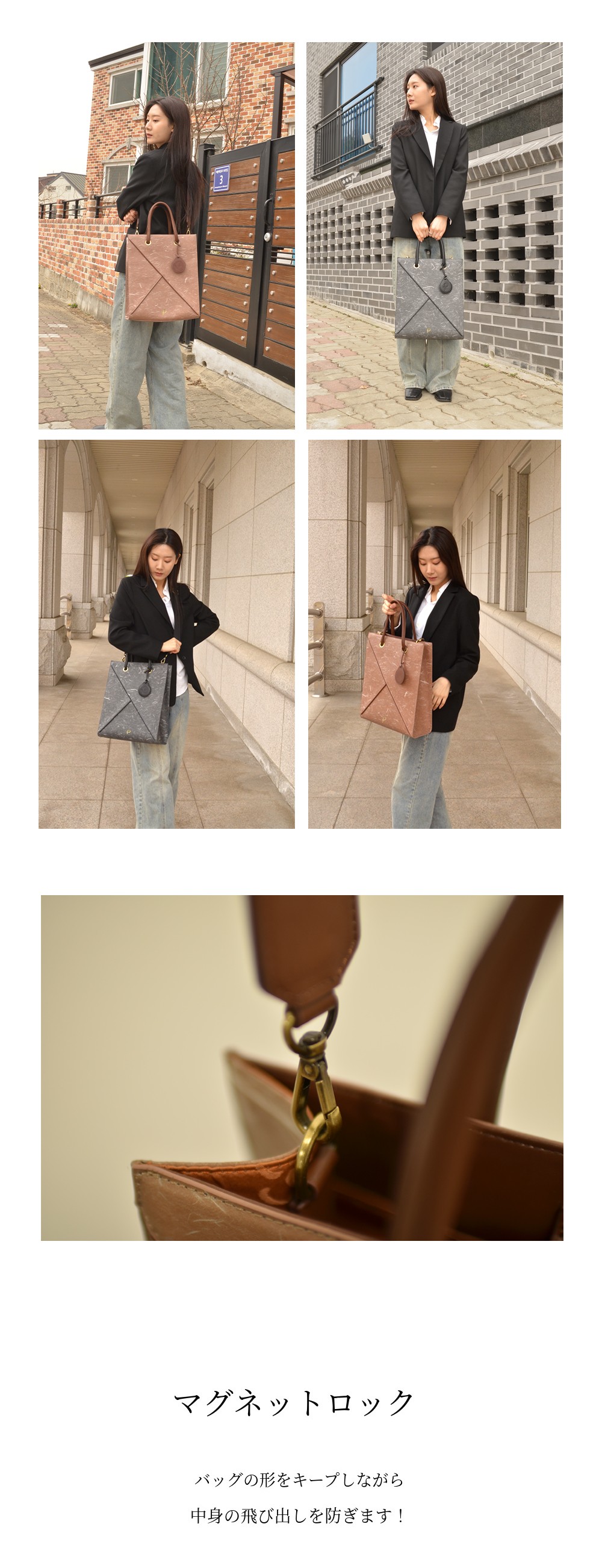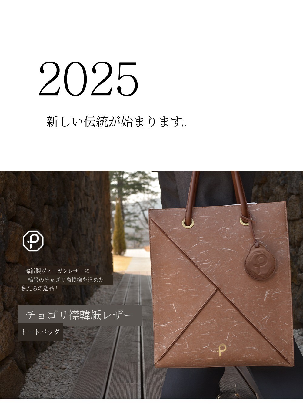 ヴィーガンレザーチョゴリ襟韓紙トートバッグは、伝統の美と趣を「現代的なデザイン感性で表現」するための【伝統的要素】と、「次世代のための責任」【環境】に重点を置いた作品です。
