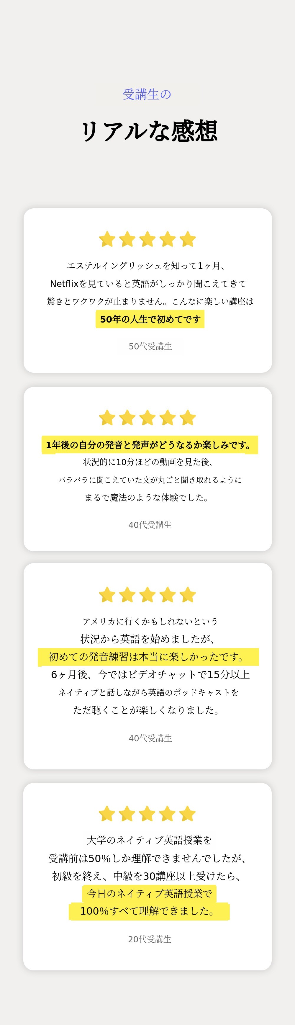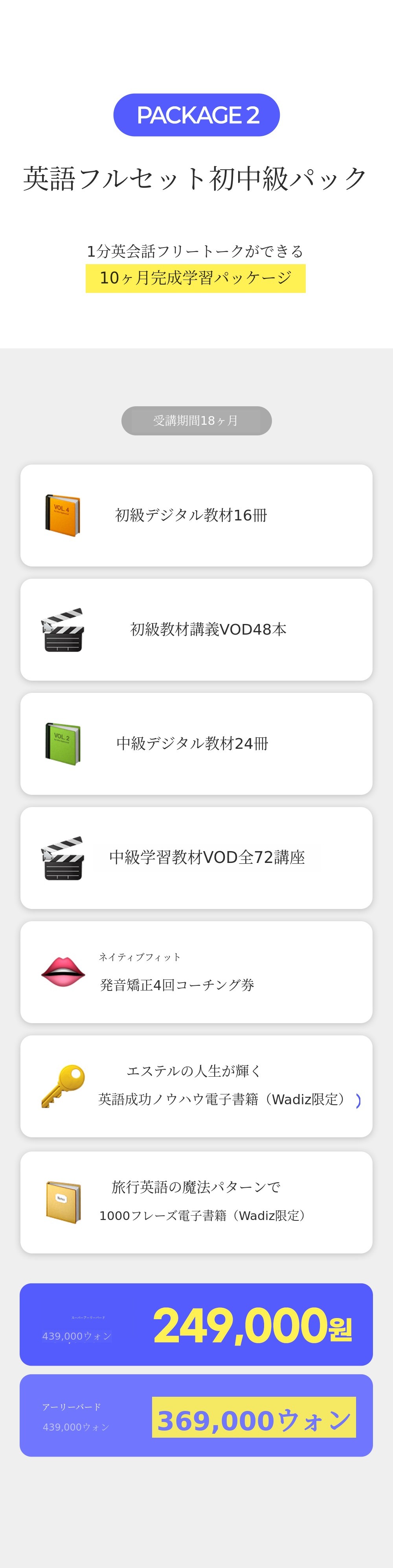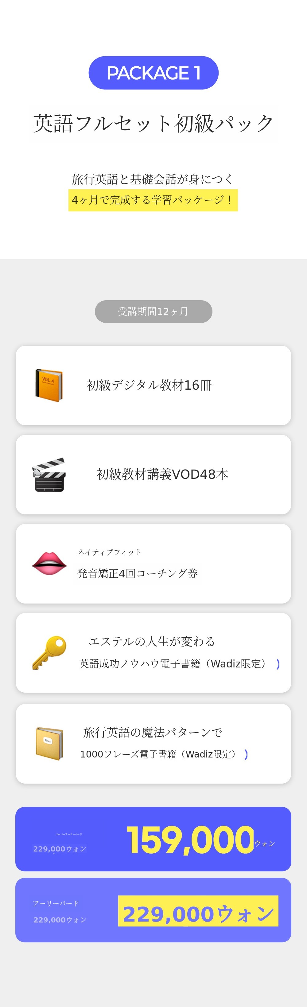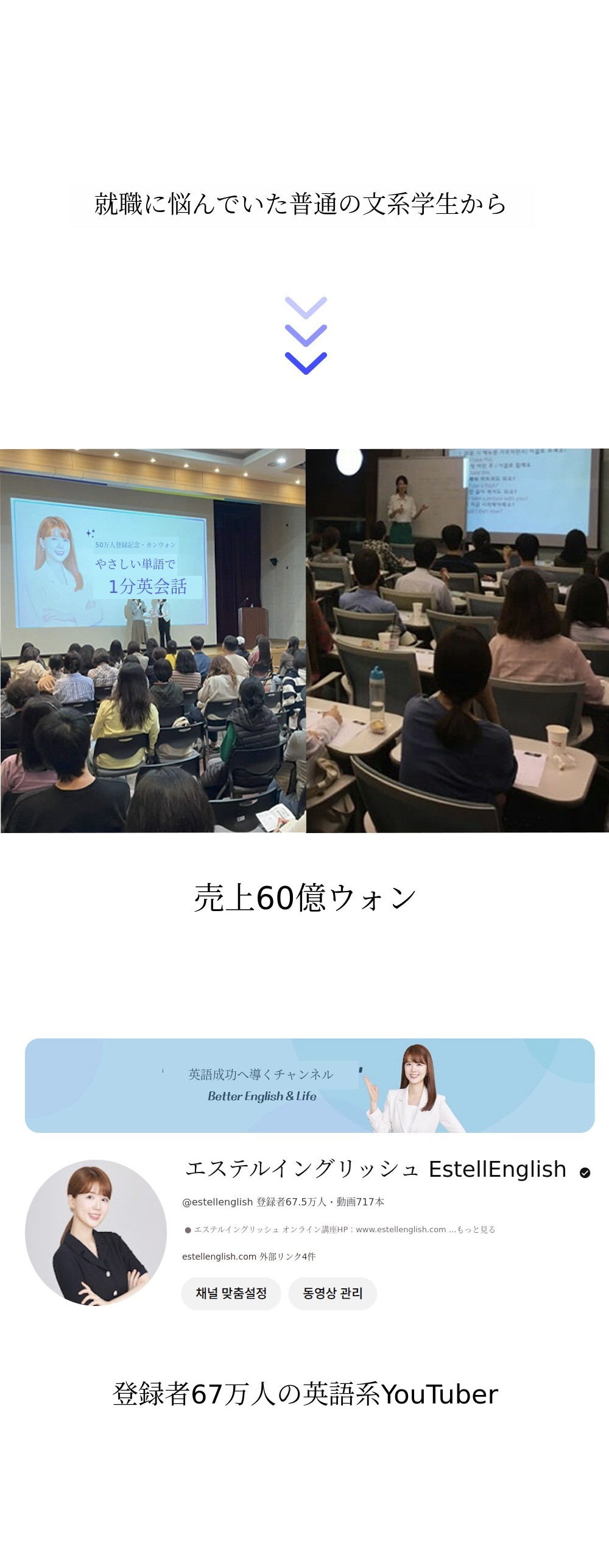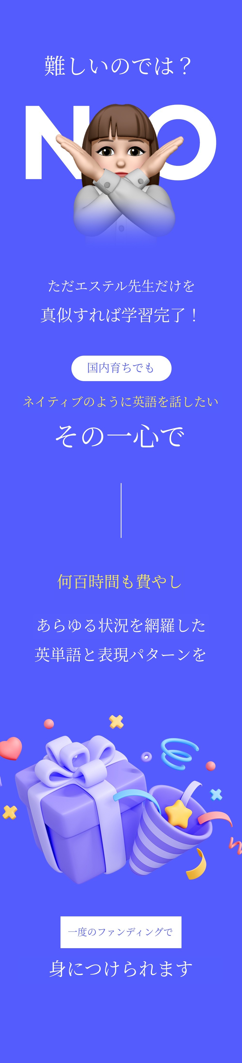 エステル先生のスピーキング授業だけ受けたのに英語リスニングが上達した、勉強していないのにTOEICの点数が上がった、準備していないのに英語面接に合格したなどの感想をいただきます。だから私の授業を基盤に英語の他の分野も簡単にできるよう、ファンディングを通じて連携した講座をたくさん作っています。