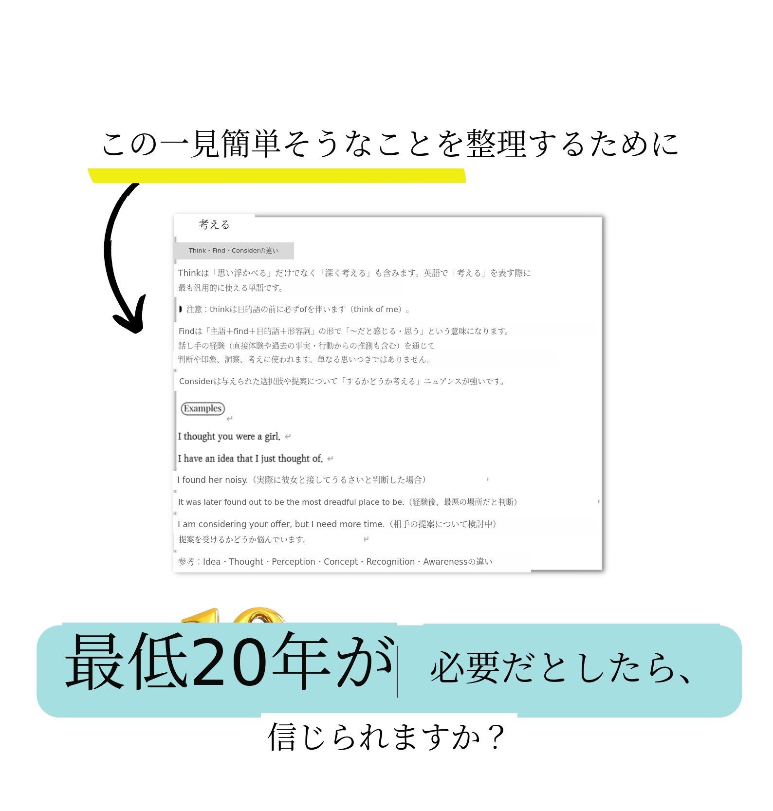 実力がついたら、ここからが始まりです。単語一つのニュアンスをきちんと整理するためには、数十、数百の例文が必要です。私は国際学部生なので毎日英語に触れていましたが、一般的な韓国人ならここから大変でしょう。そしてこうしてやっと、「この単語はこういうニュアンスなんだ!」とやっと仮説を立てて、検証します。もし間違っていたらこの過程を無限ループ!