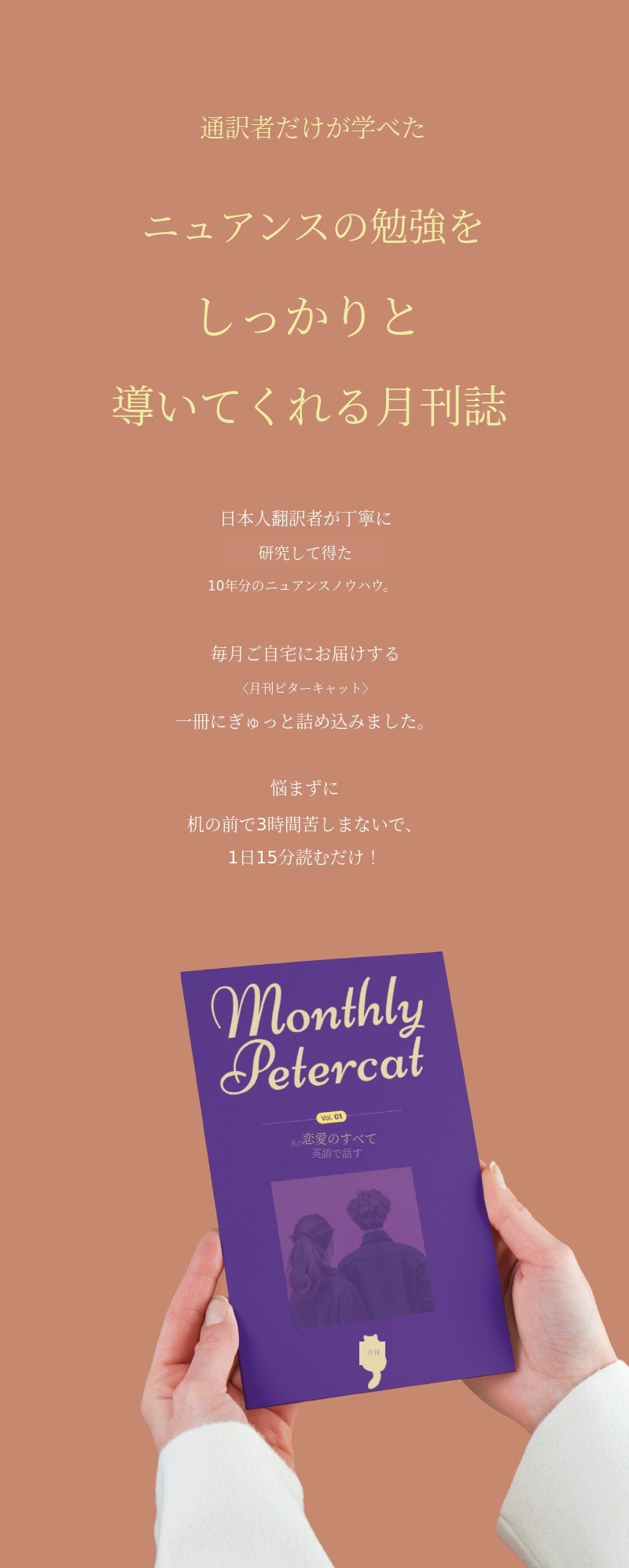 毎月変わるテーマでこのときめきを最大化し、自分の玄関先に届く強制力まで備えた効果的な英語学習サービスそれが<月刊ピーターキャット>です。