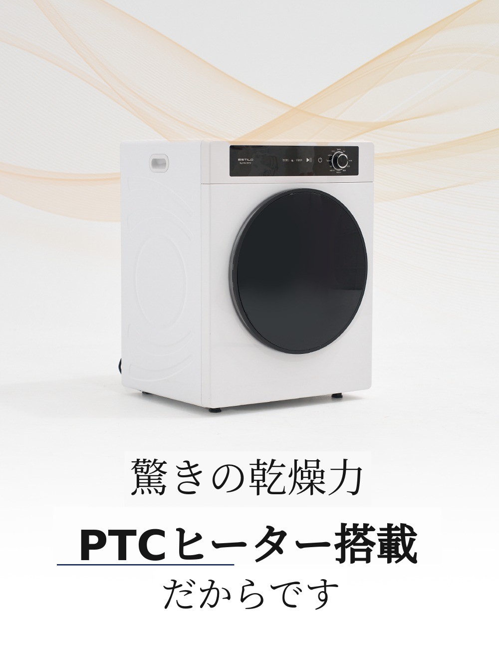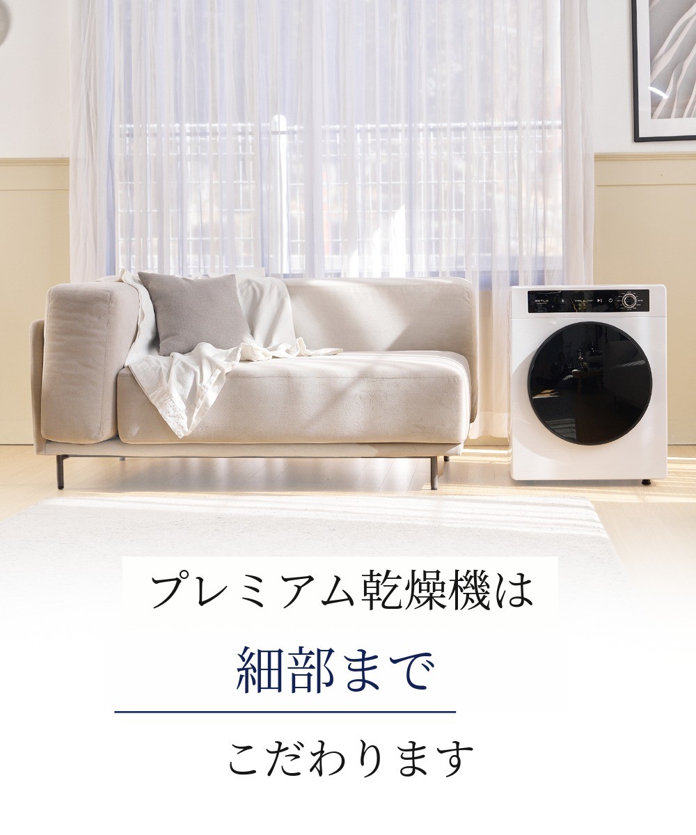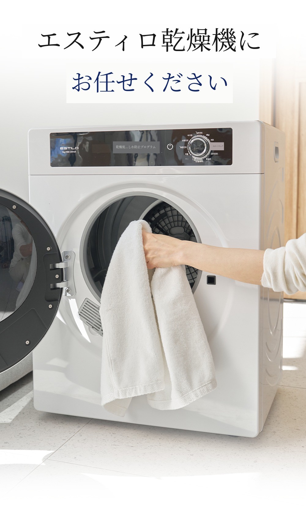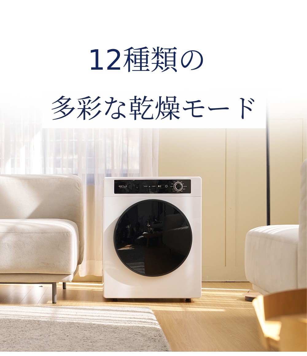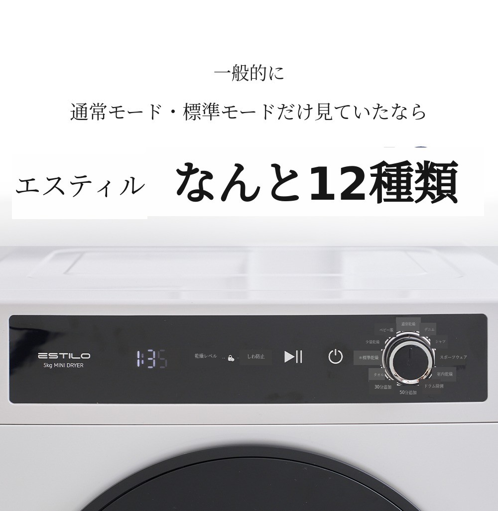 エスティロ5kgスマート乾燥機は洗濯物が含んでいる水分量、 温度、湿度を感知して最適化されたアルゴリズム/プログラムで作動します。そのため、初期表示画面に出た時間より早く、または長く乾燥されることがあります。
