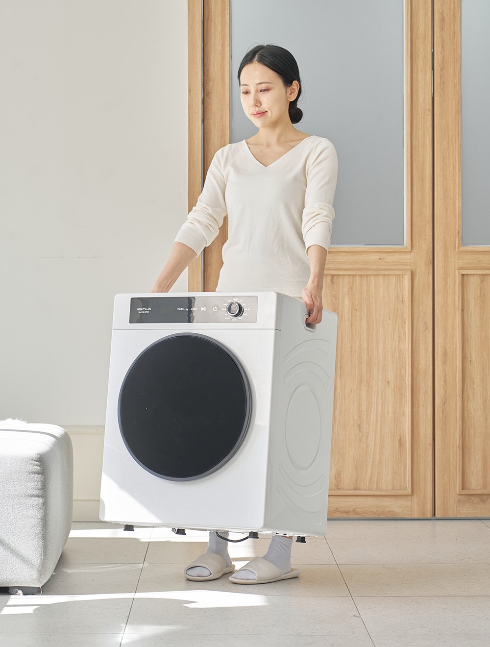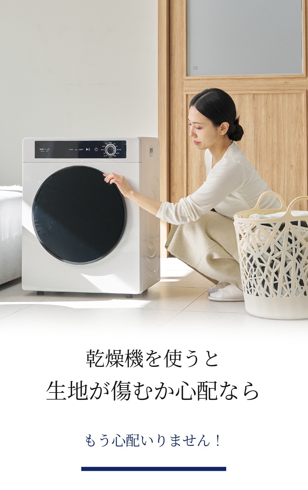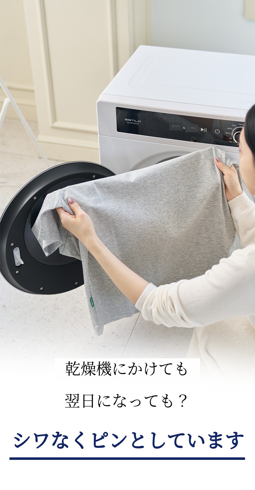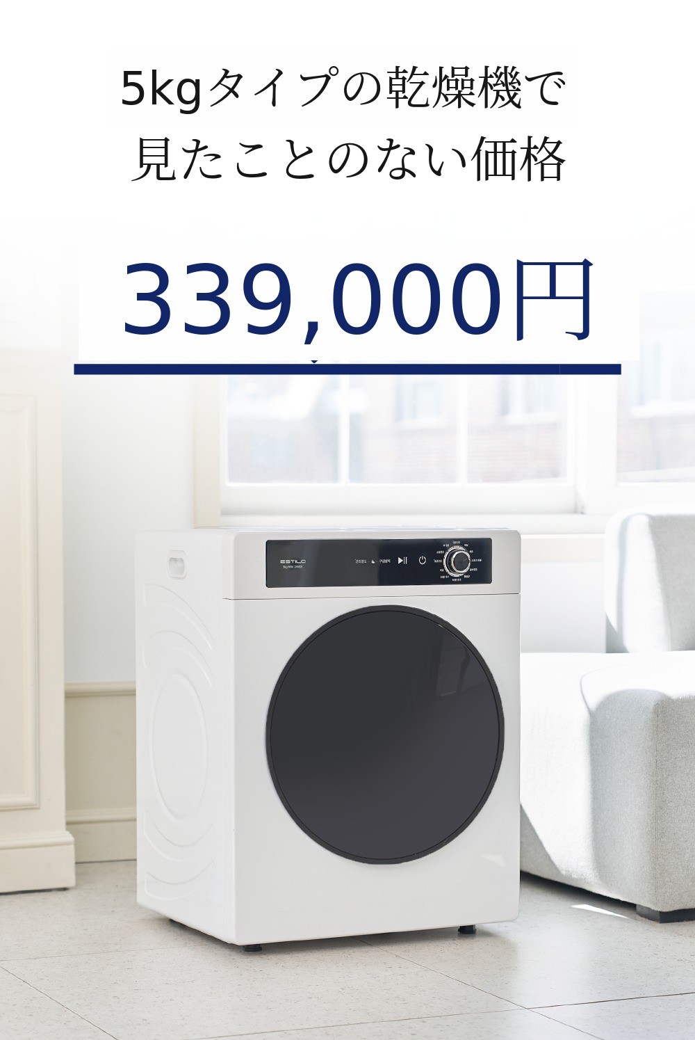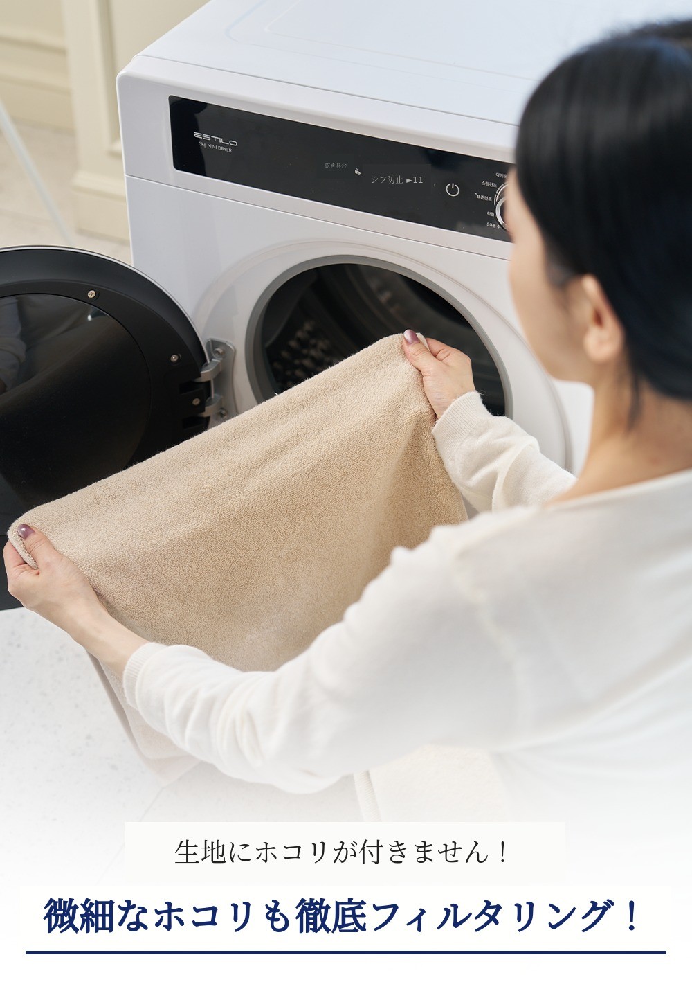 エスティロ5kgスマート乾燥機は洗濯物が含んでいる水分量、 温度、湿度を感知して最適化されたアルゴリズム/プログラムで作動します。そのため、初期表示画面に出た時間より早く、または長く乾燥されることがあります。