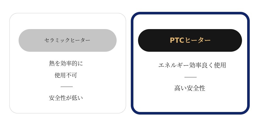 PTCヒーターは空気を燃やさずに温める高価な航空暖房技術で、予熱なしで空気を即座に温めて循環させる方式です。そのためセラミックヒーターより熱効率が優れており、乾燥能力が高いです。さらに有害な煙やガスを発生させません。