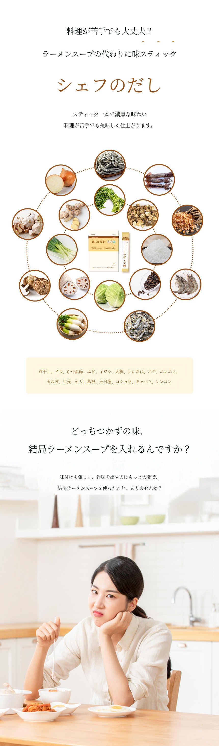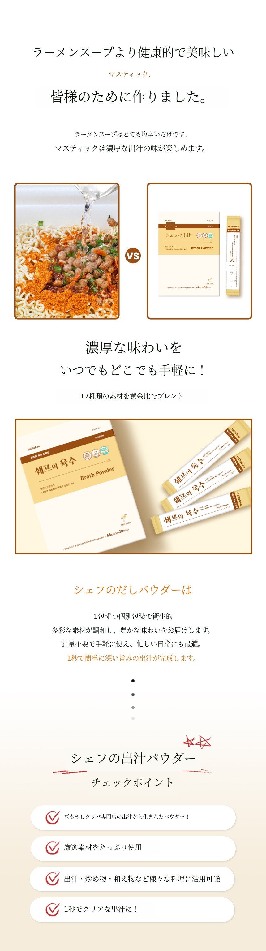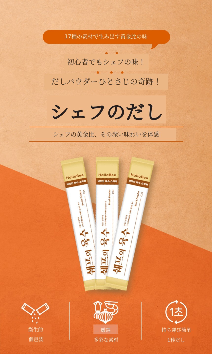 1. 🍲 17種素材の黄金比ブロス粉末 - 誰でもシェフの味を簡単に再現できます 2. ⏱️ 1秒で簡単調理 - 煮出し不要で多様な料理に使えます 3. 🎁 試食用スティックプレゼント - 個包装のスティック3本を無料提供します