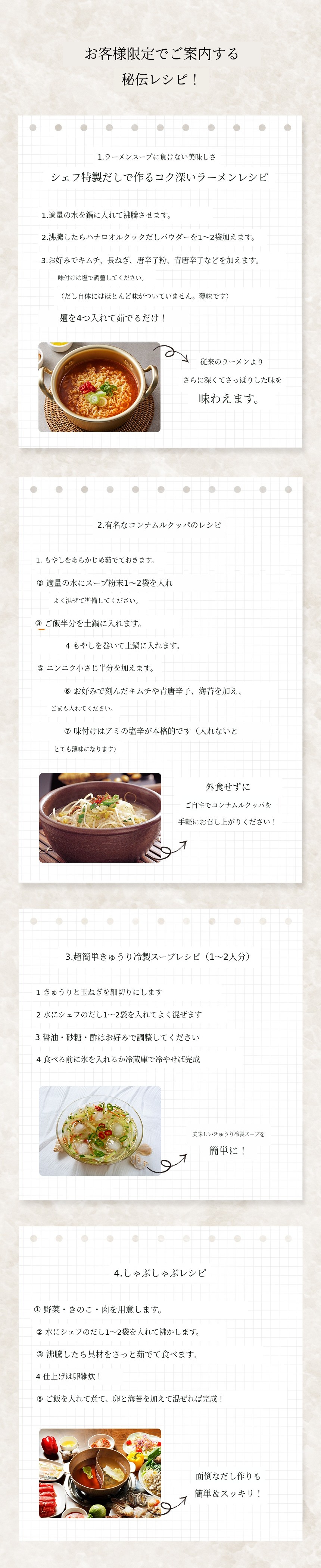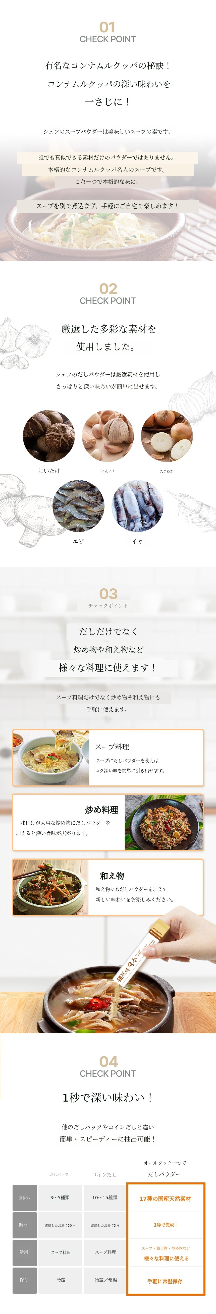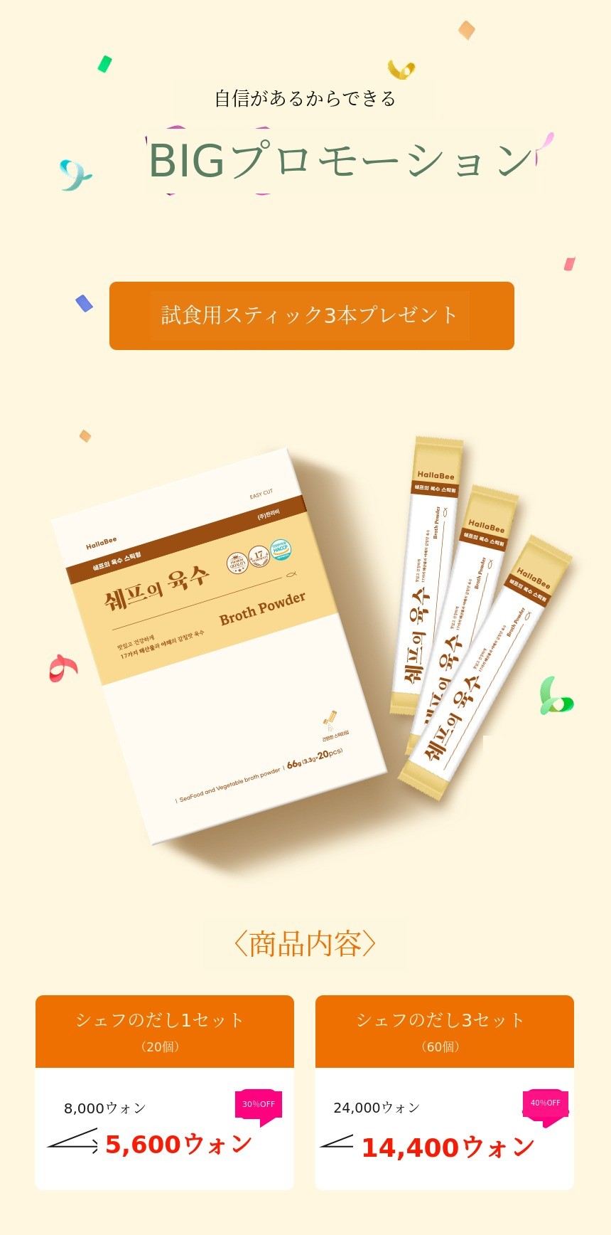 1. 🍲 17種素材の黄金比ブロス粉末 - 誰でもシェフの味を簡単に再現できます 2. ⏱️ 1秒で簡単調理 - 煮出し不要で多様な料理に使えます 3. 🎁 試食用スティックプレゼント - 個包装のスティック3本を無料提供します