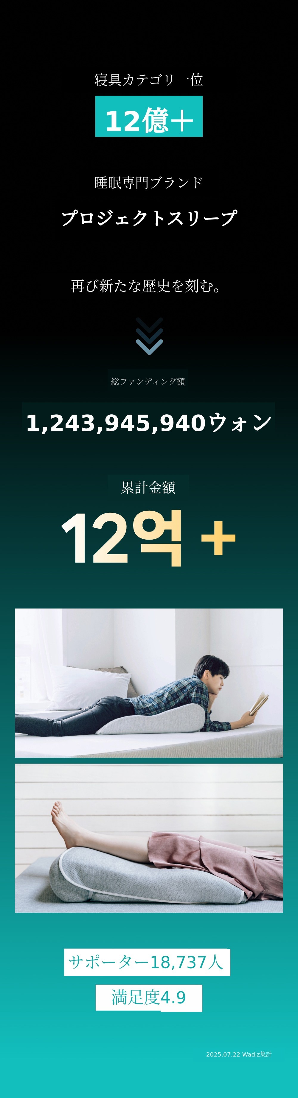プロジェクトスリープの最初のプロジェクトであるマットレスを通じてオンラインチャネルで〜97%の顧客満足度(自社モール集計:2025.04)を示し、快眠基本権のために先頭に立ちました。マットレスからさらに進んで枕、寝具など、より多くの方々の良い眠りのための製品開発に多くの悩みと時間、努力を込めています。プロジェクトスリープの真摯さと開発過程を詳しくお伝えできる最適な空間がWadizだと考え、Wadizで私たちのプロジェクトを紹介します。