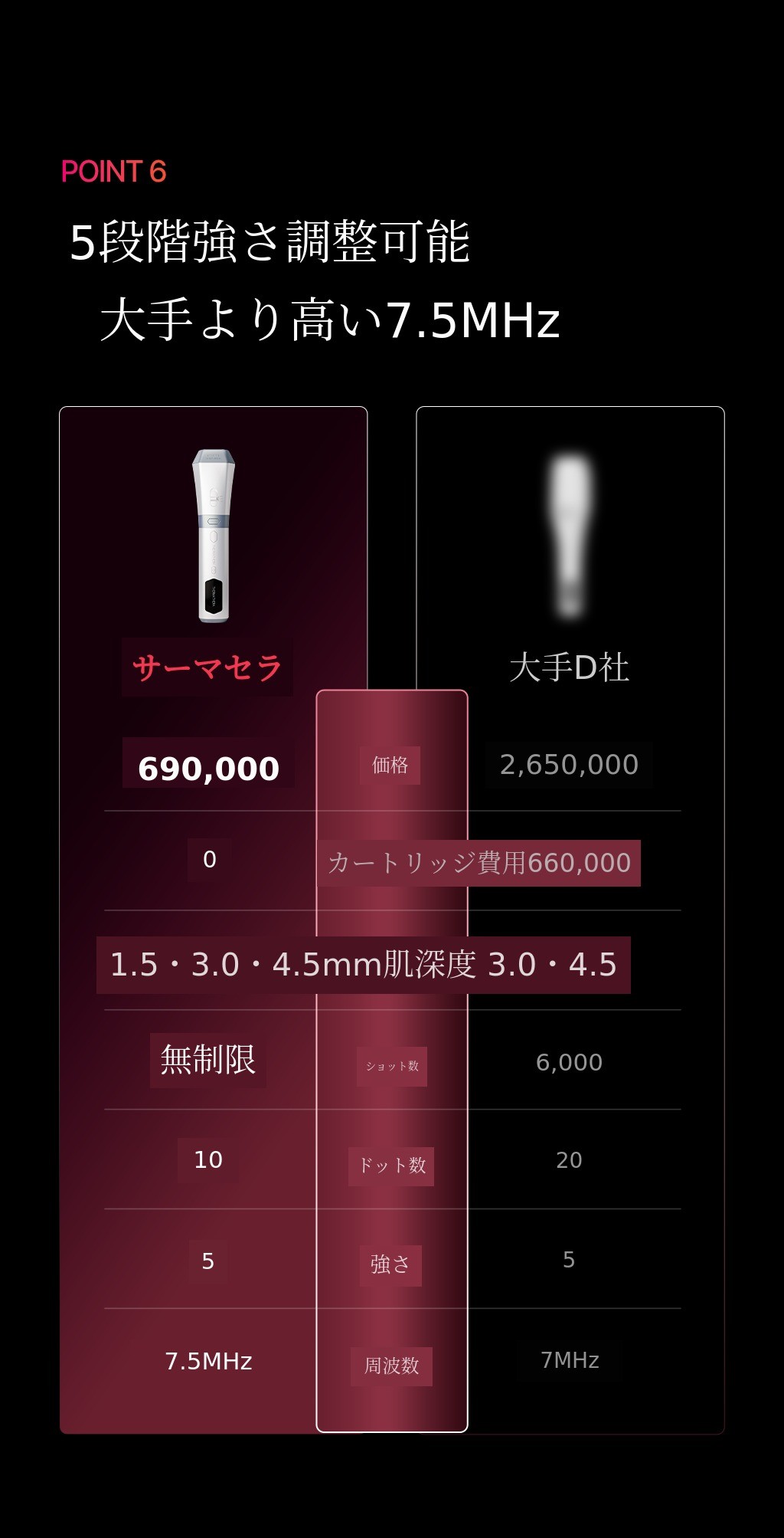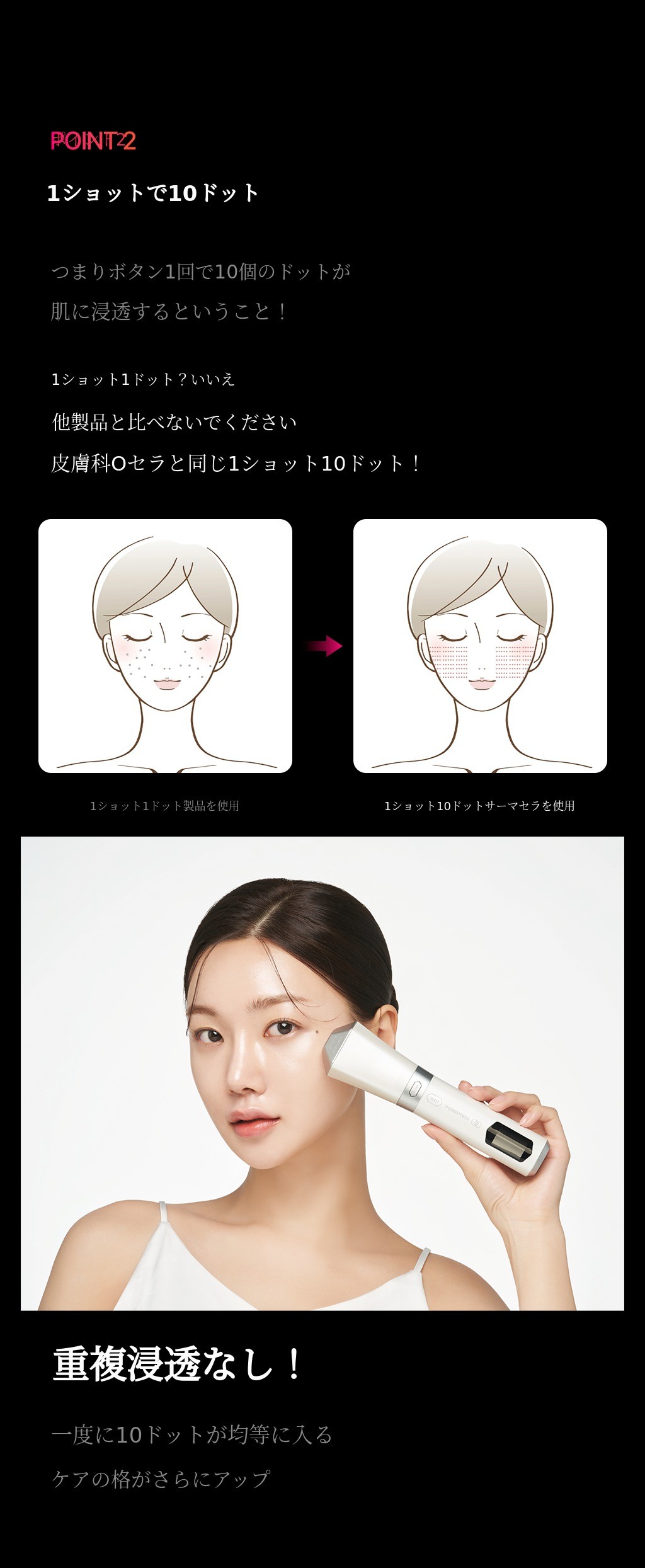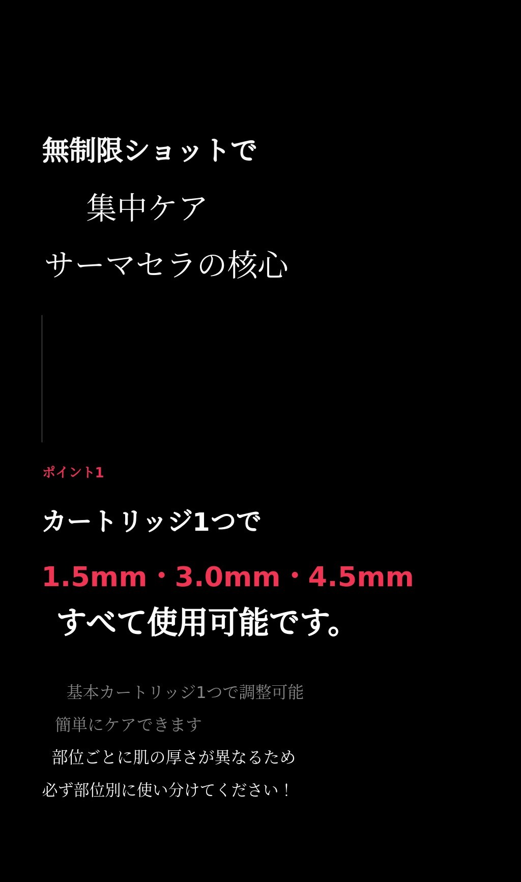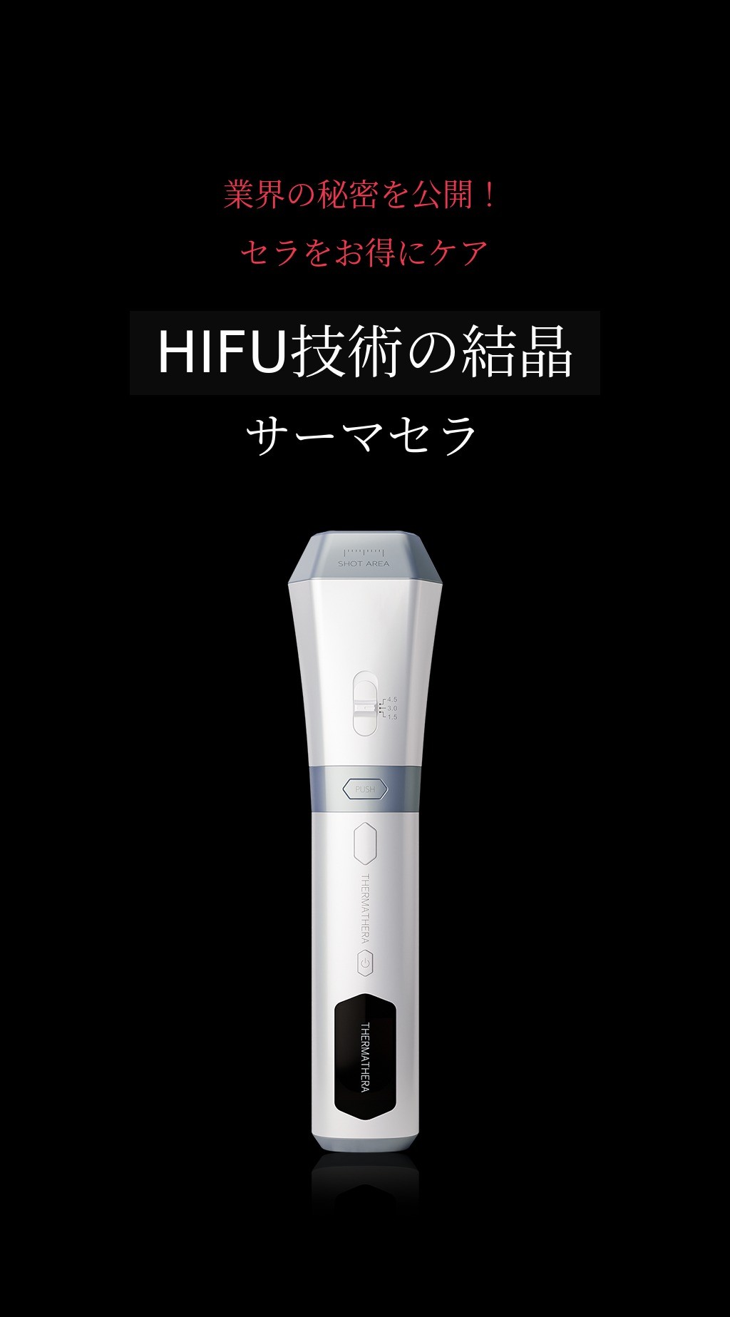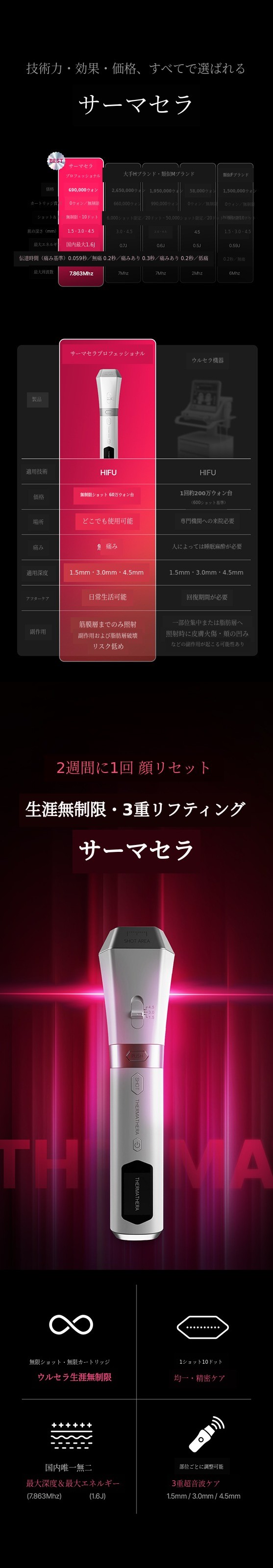 1.5mm~4.5mmのSMAS層まで浸透するHIFUは密度が重要です。サーマセラは隙間なくケアできるので簡単で効果的です。