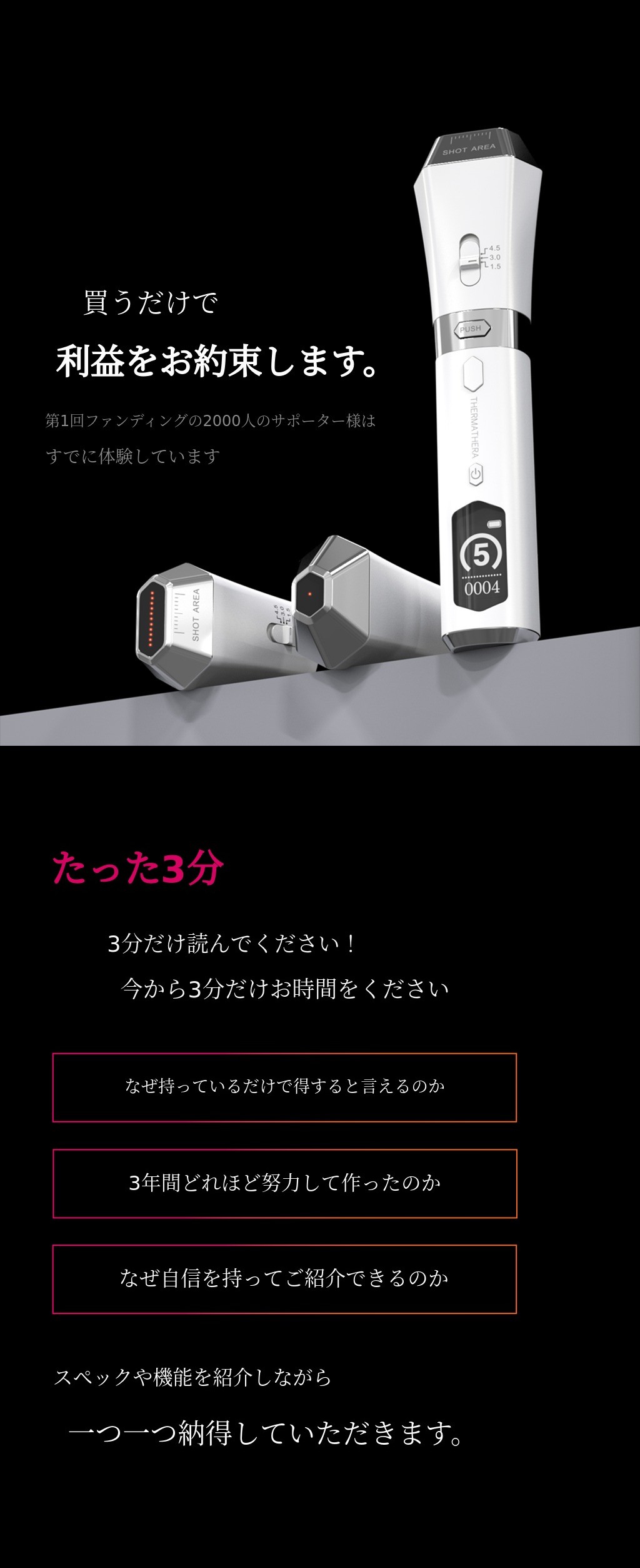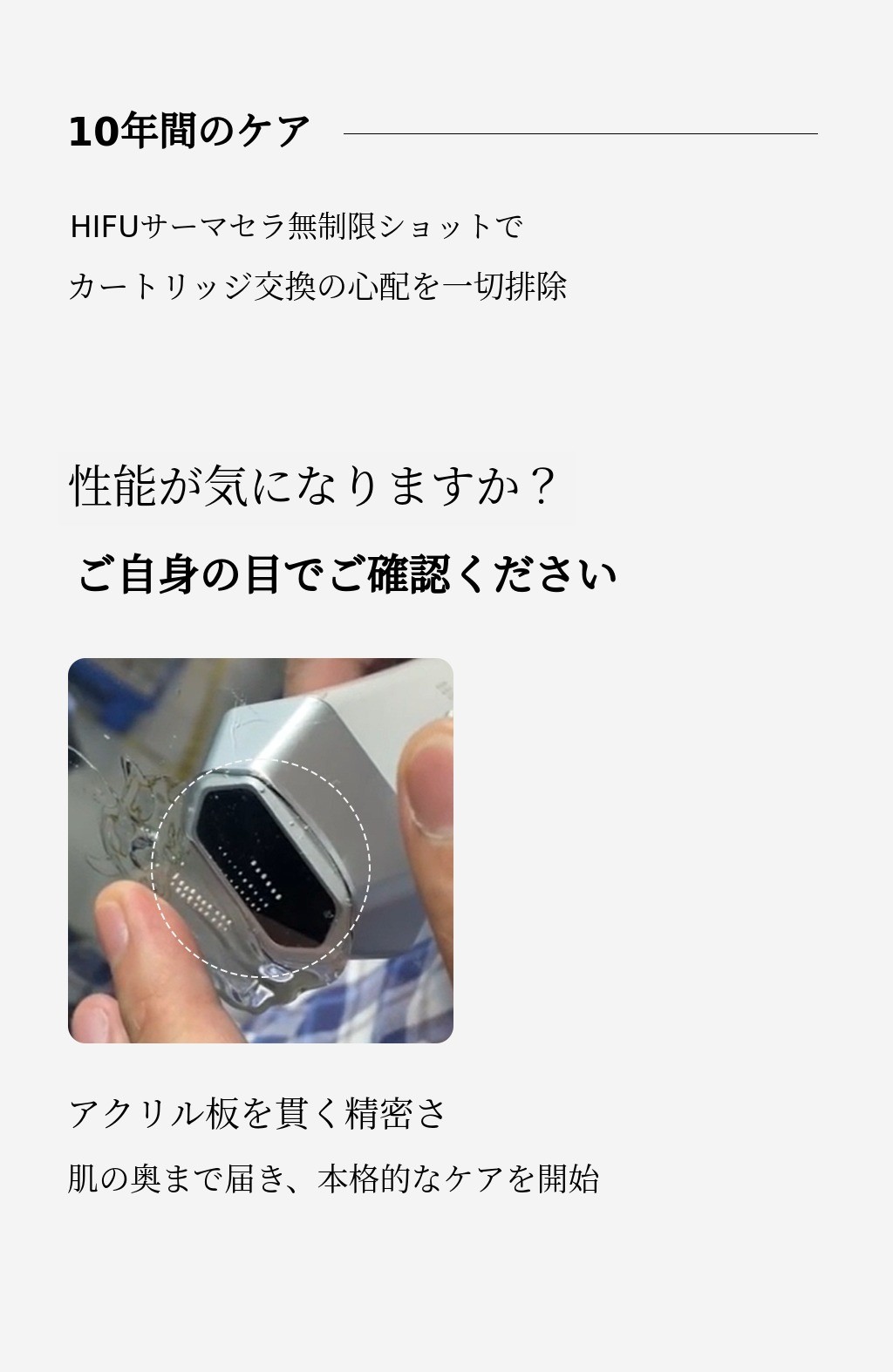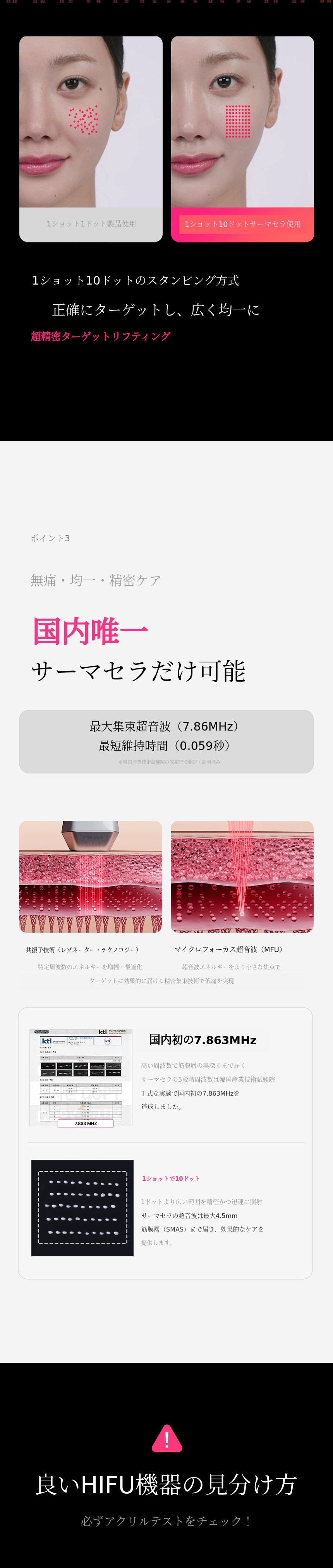 アンコールファンディングにご参加いただくサポーターの皆様にあらかじめお伝えします。第1回ファンディングでは多くのサポーターの方々からお問い合わせをいただきましたが、痛みだけあってアクリル板に熱点を作れない製品がとても多いです。1.5mm/3.0mm/4.5mmまで痛みなく肌の中だけに超音波エネルギーを伝達できることが「サーマセラの核心」です。製品を受け取った後、まず超音波ジェルでテストしてみてください。ジェルがパチパチと跳ねれば問題ありません!