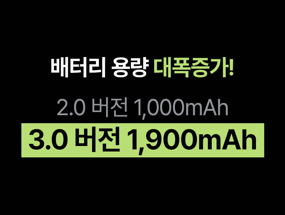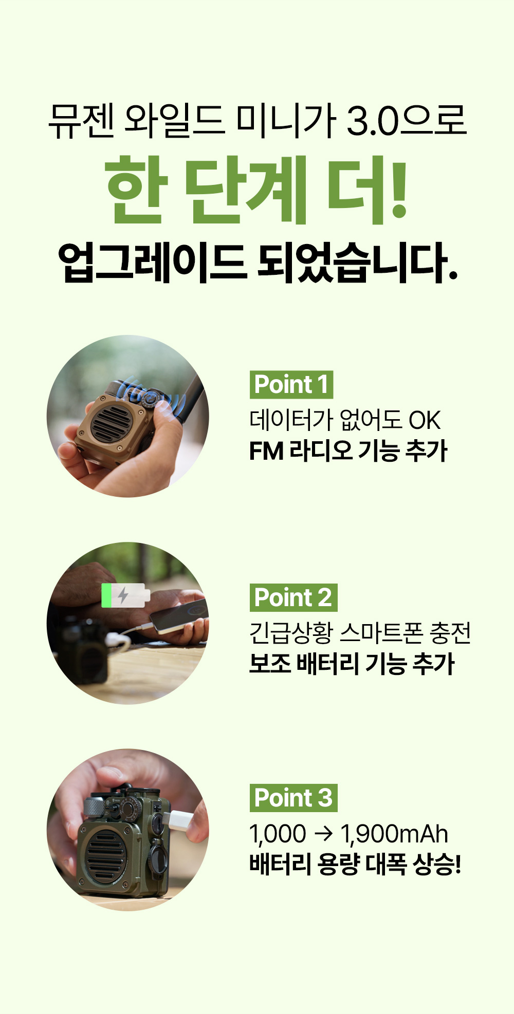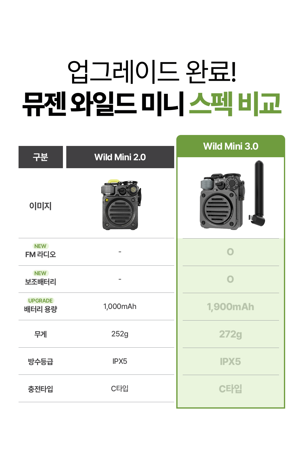 뮤젠 와일드미니 3.0의 주요 업그레이드된 부분은 많은 서포터분들께서 꾸준히 요청하신 FM 라디오 기능 탑재가 되었으며, 배터리 용량 1,000mAh → 1,900mAh 으로 대폭 향상되었습니다.