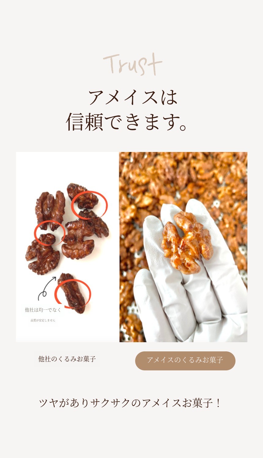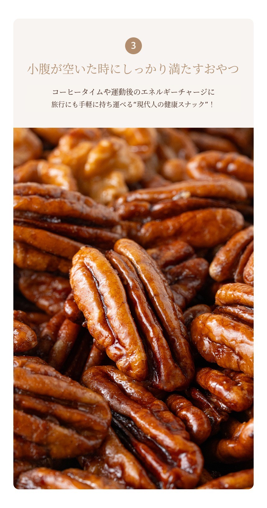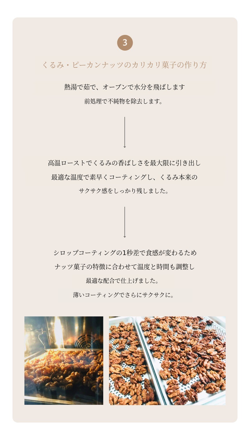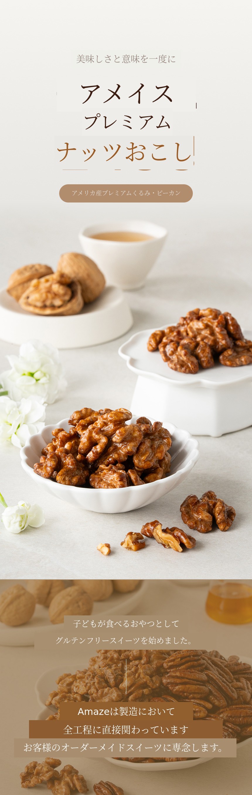 ナッツの渋いイメージを払拭したくて研究しました。甘くないシロップを自ら作り、焼き上げる工程を経ています。前回のプロジェクト成功後、美味しくて健康的なナッツデザートをもう一度ご紹介したいと思いました。