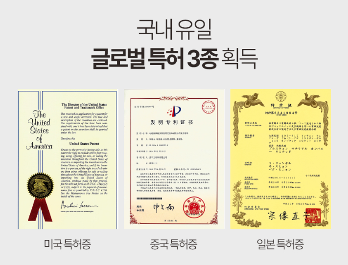 글로벌 특허 3종 획득: 미국, 중국, 일본 3개국에서 특허를 획득하며 그 기술력을 세계적으로 인정받았습니다.