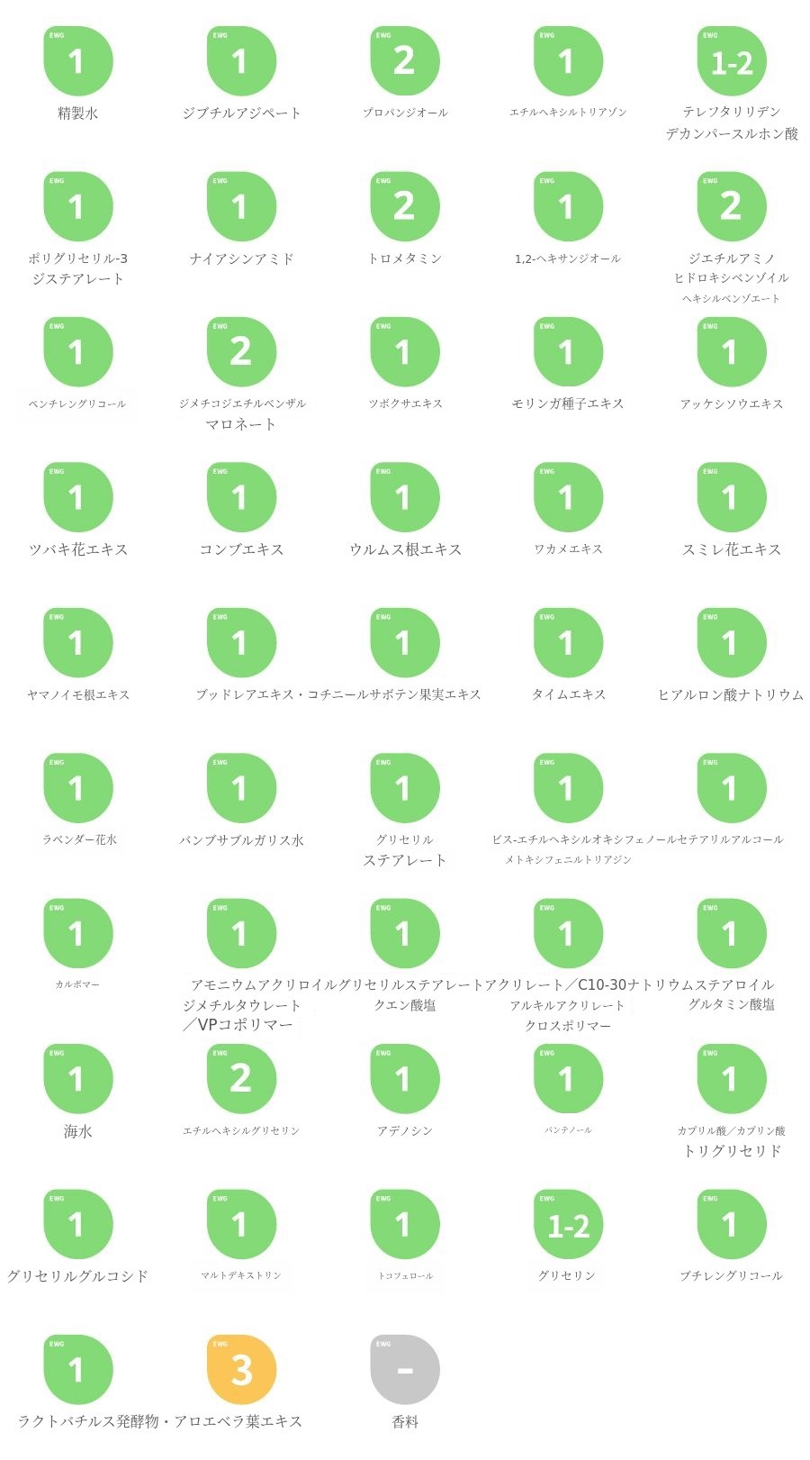 - アロエベラ葉エキスは肌の鎮静効果に欠かせないため、EWG一般グレードで配合しました。