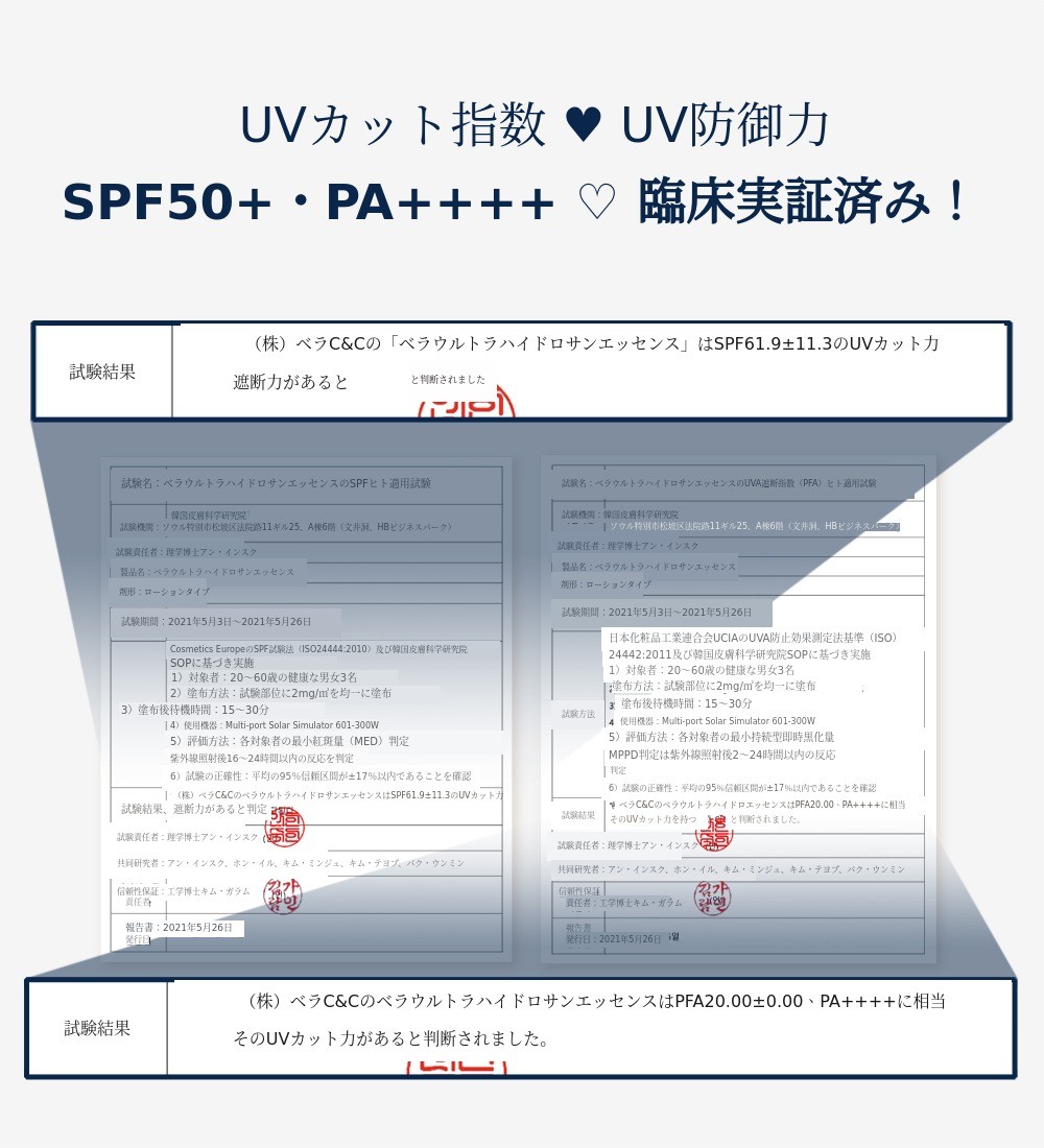 最近、紫外線カット指数に関する話題がありましたよね?ベラヴィーガンウォーターサンエッセンスは、製品発売と同時に迅速に臨床申請を行い、紫外線カットまで確実に確認しました。SPF50+、PA++++の数値において紫外線カット力があると判断されたという公認臨床機関の結果報告書を受け取りました。