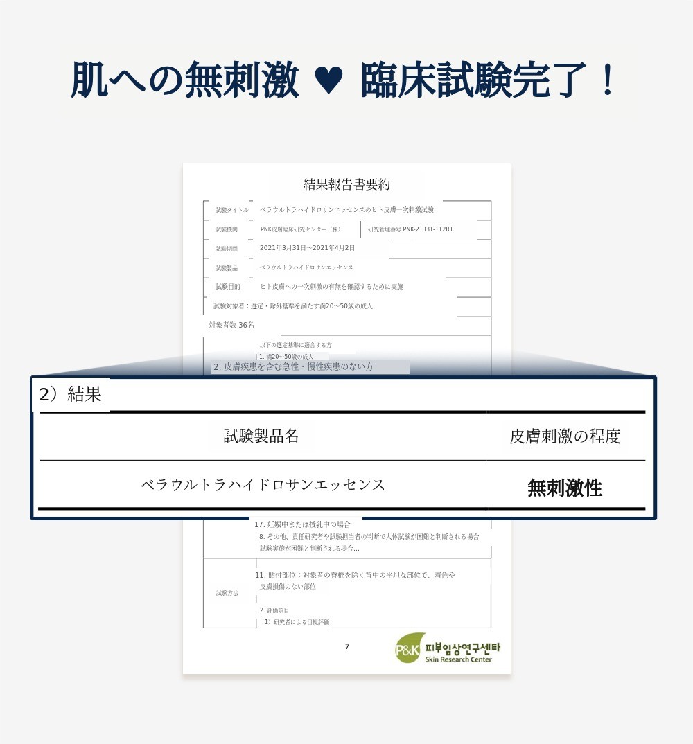皮膚刺激に関しても必ず確認しなければなりませんよね?これも公認機関を通じて臨床依頼を行い、ベラサンエッセンスは皮膚に刺激・非(無)刺激性であることが確認されました。