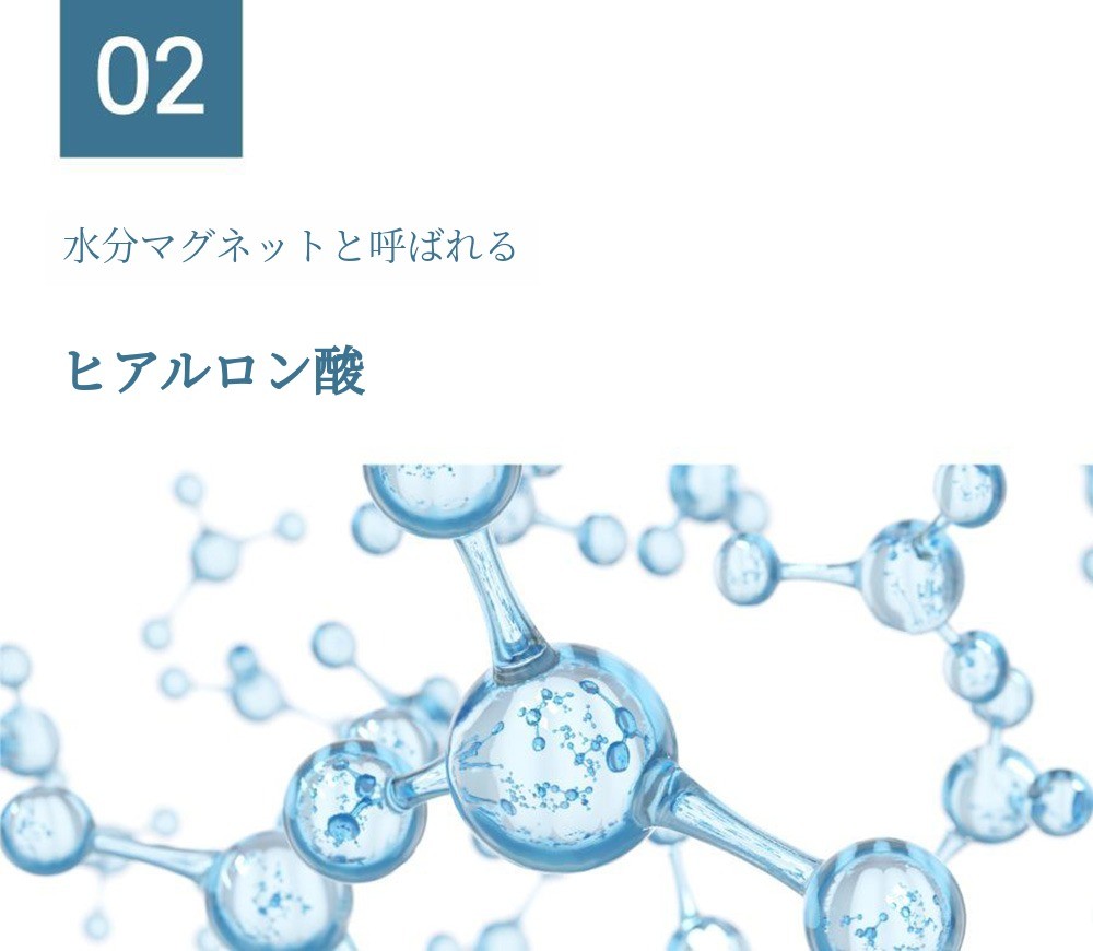 私たちの肌に自然に存在する保湿因子の一つで、水分を引き寄せて肌をしっとりと保つのがヒアルロン酸です。しかし 年齢を重ねるほど肌が持つヒアルロン酸が減少し、そのために 乾燥がひどくなってしまうのです。だから私たちは不足したヒアルロン酸を補うために化粧品を塗って肌に水分を補給するのです。自分の体積の1000倍の水分を引き寄せる力を持つ水分貯蔵庫がヒアルロン酸という話は何度も聞いて飽きているかもしれませんが、絶対に必要な成分です。