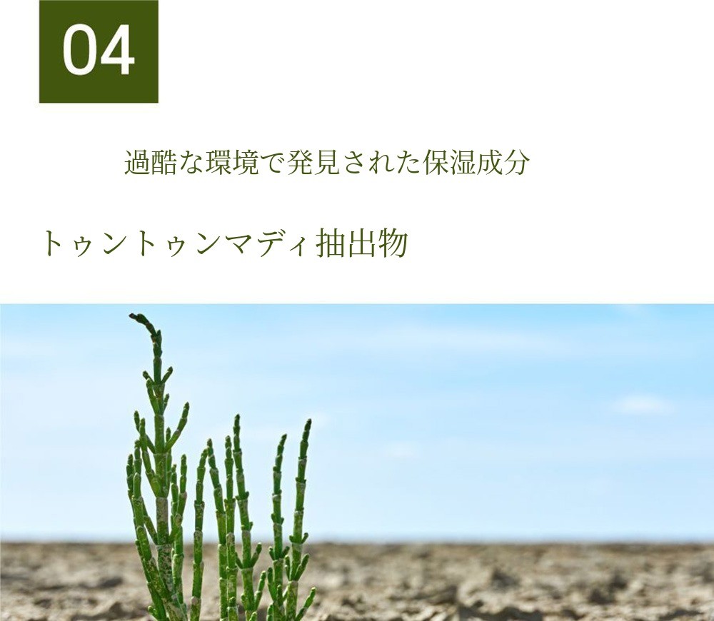 地中海や大西洋付近の塩分が多い海岸でも水分を失わずに生き抜く強い植物、サリコルニア(アッケシソウ)から由来した原料です。アッケシソウは海水がよく出入りし、土地が比較的よく固まる干潟で生息し、海水の塩分を吸収しながら育つことからハムチョウと呼ばれています。地球上ではほぼ唯一、塩分を吸収しながら育つ陸上植物であり、天然ミネラルやアミノ酸などの栄養素が豊富に含まれているため、保湿に効果的な成分です。
