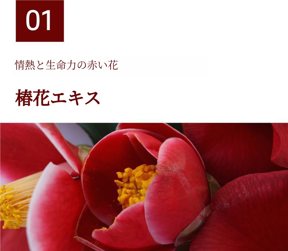 椿花エキスにはお茶に多く含まれているカテキンという成分が含まれています。カテキンはエピガロカテキンガレートと呼ばれるポリフェノール成分で、EC、EGC、ECG、EGCGなどがありますが、この中でEGCGがカテキンのおよそ50%を占め ます。これの最大の効果はビタミンCの100倍以上の効果があると知られています。ビタミンK、ビタミンC成分が含有されており、敏感で疲れた肌に豊富な栄養を与え、なめらかでもっちりとした肌になることができます。