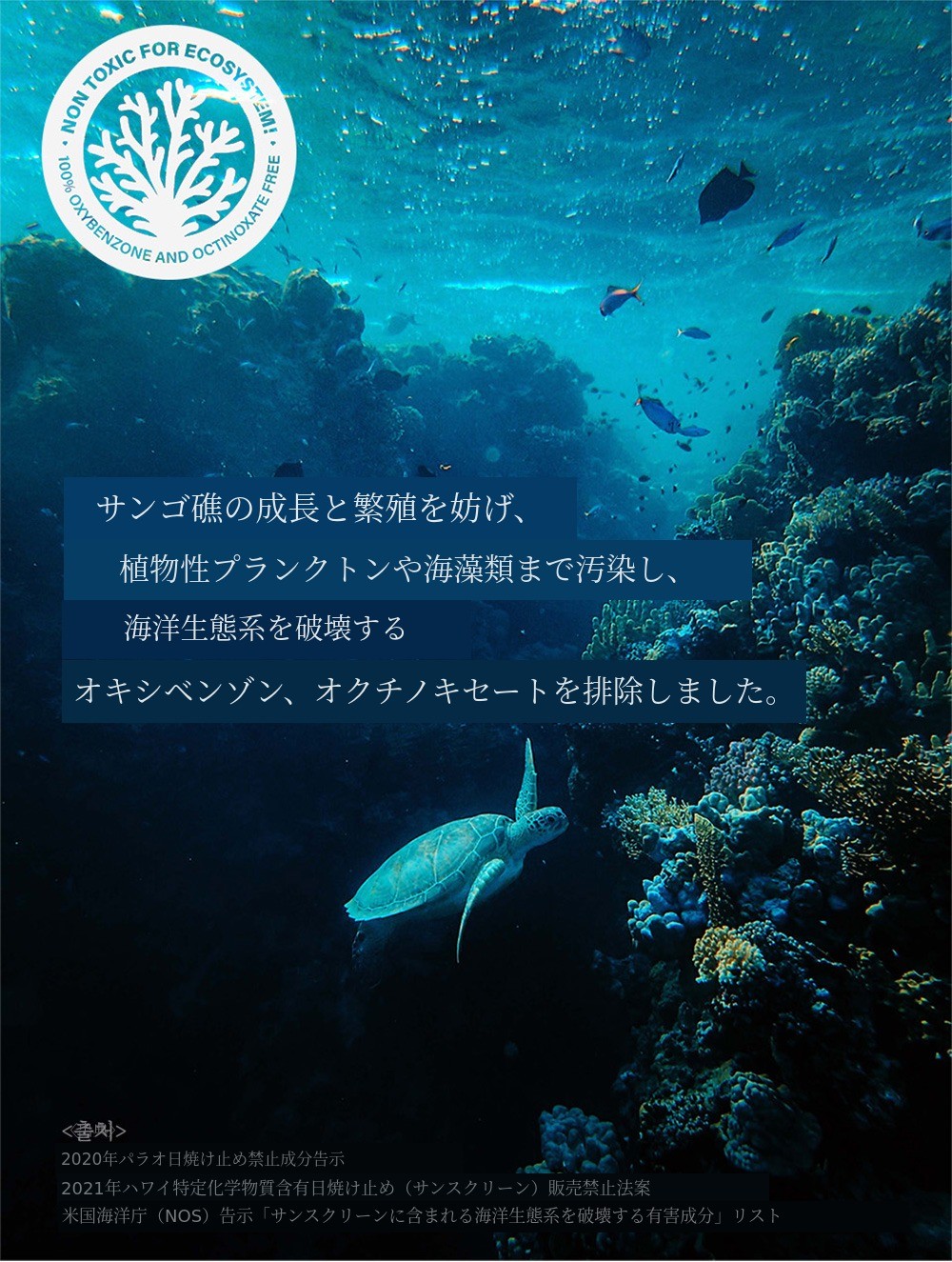オキシベンゾンは海中のサンゴ礁が白く脱色する白化現象やDNA損傷を引き起こして正常な成長や繁殖を妨げるといわれています。またオクチノキセートはサンゴ礁の有害ウイルスを活性化させ 最終的にサンゴ礁を死滅させると知られています。これにより植物性プランクトンや海藻類まで汚染されるといわれており、本当にこれは絶対に避けるべきだと思いました!