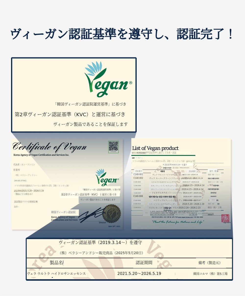 製品開発段階からヴィーガン化粧品を掲げてきました。ヴィーガンフォーミュラを基に開発されました。数ヶ月間の書類審査を経て韓国ヴィーガン認証院から認証書を受け取り、このように公式にヴィーガン マークを付けることができました。