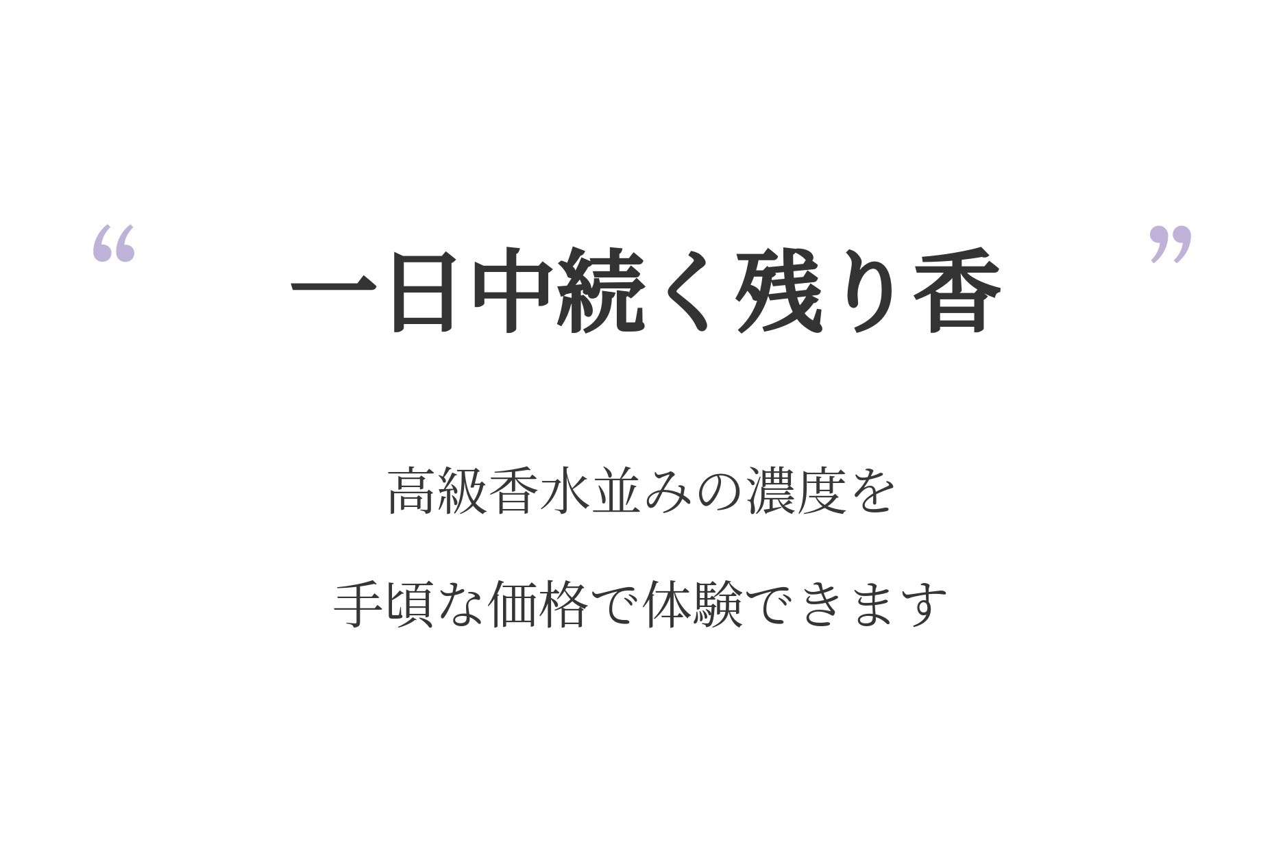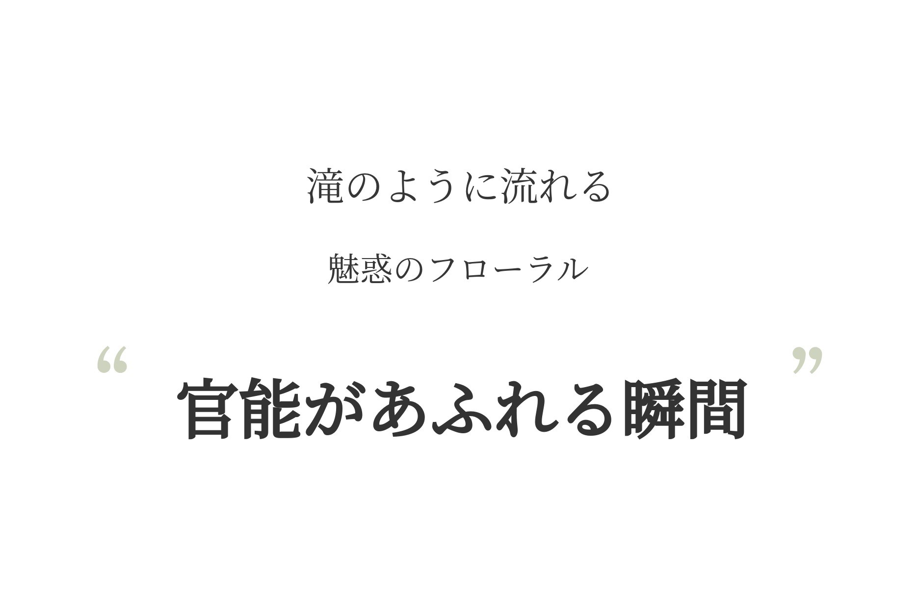 スズラン、ジャスミン、フリージア、ローズなどの「フローラル」な香りを中心に、温かく柔らかく、それでいてほのかな花の香りが豊かに広がるのが特徴です。香りが長く残り、徐々に深みが増していきます。